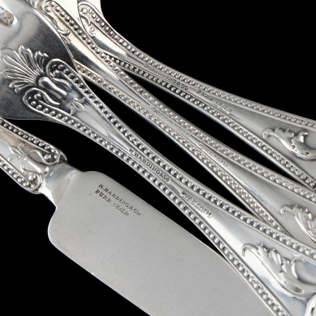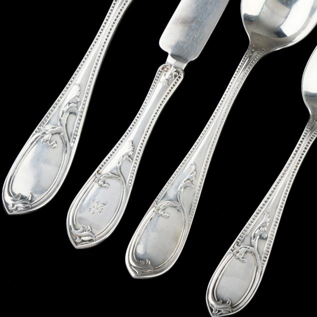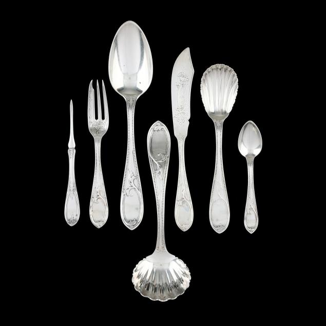 Boston, circa 1810-1854; (73) items to include: (12) knives (7 3/4 in.); (12) forks (7 1/2 in.); (15) teaspoons (5 3/4 in.); (6) oval bowl place spoons; (8) tablespoons; (6) demitasse spoons; (10) butter picks; a gravy ladle; a sugar spoon; a fish fork; and a fish knife; all with period stylized "m" monogram to the verso handles; presented in a fitted flatware box.