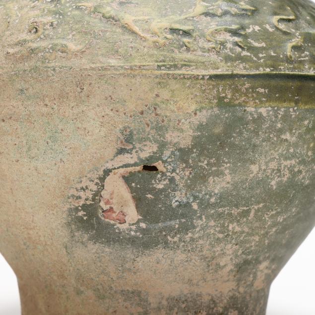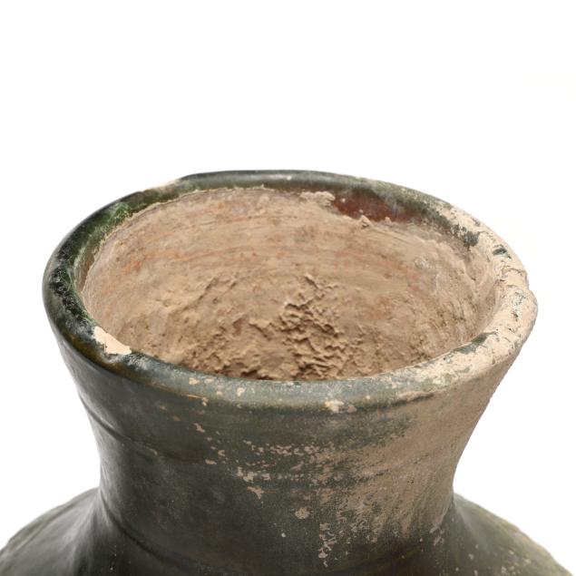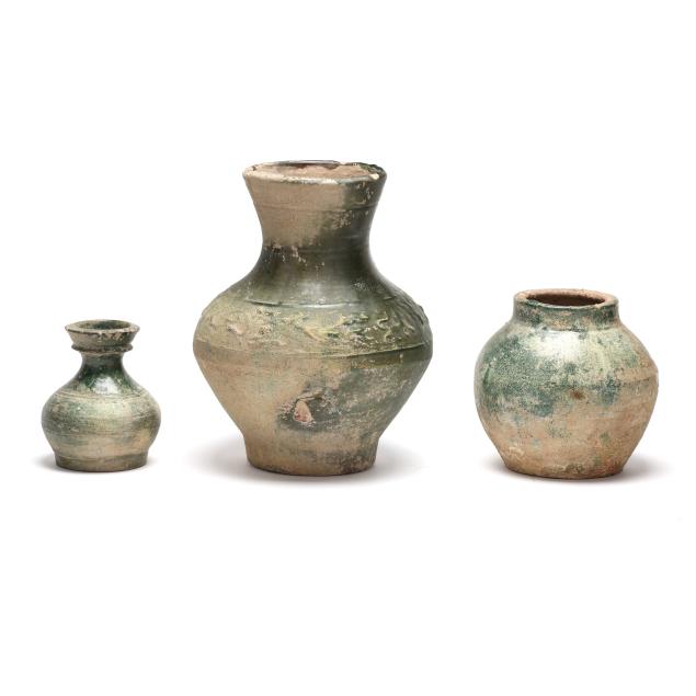 Han dynasty period or style, three earthenware jars of varying size, each with dark green glaze with some iridescent encrustations to the body, unglazed to the underside.