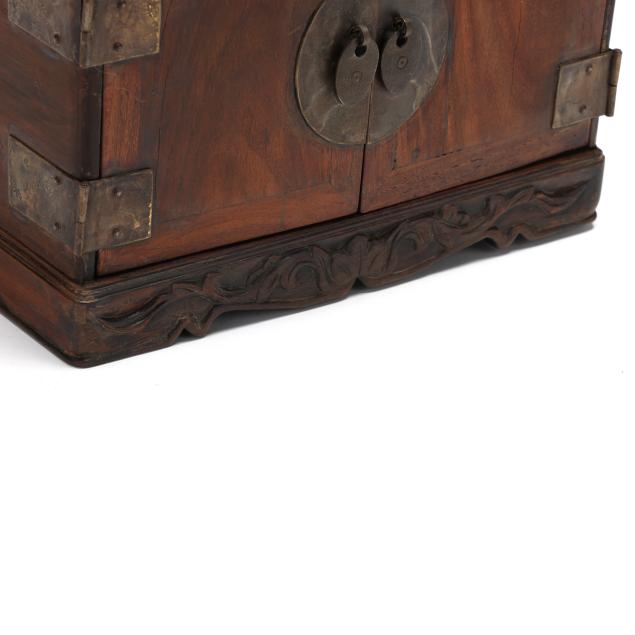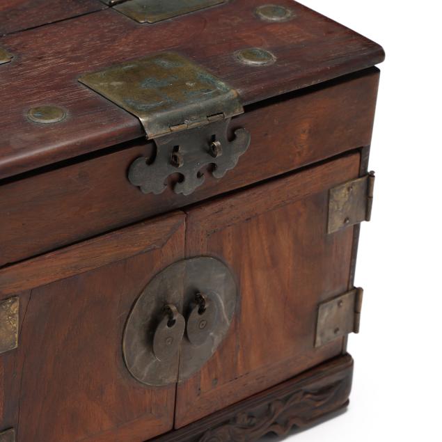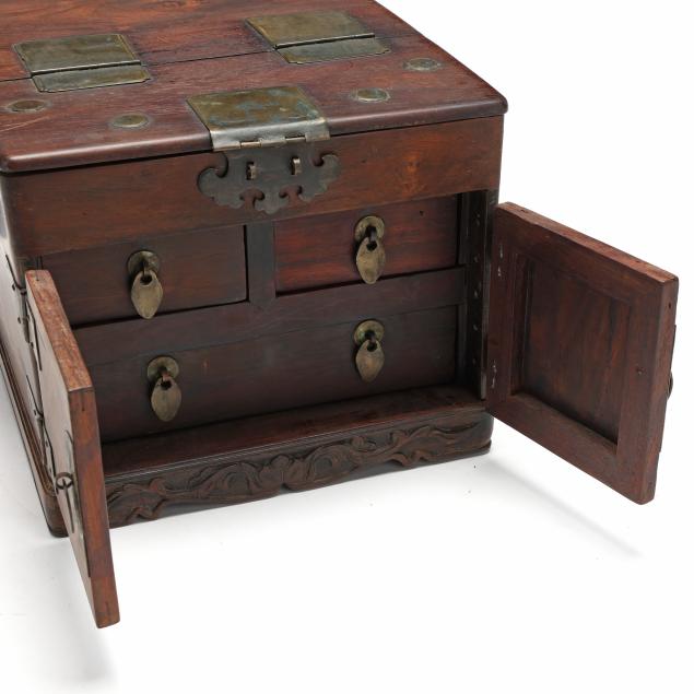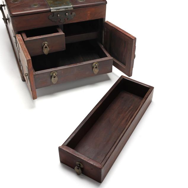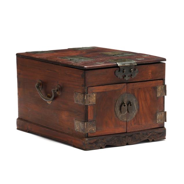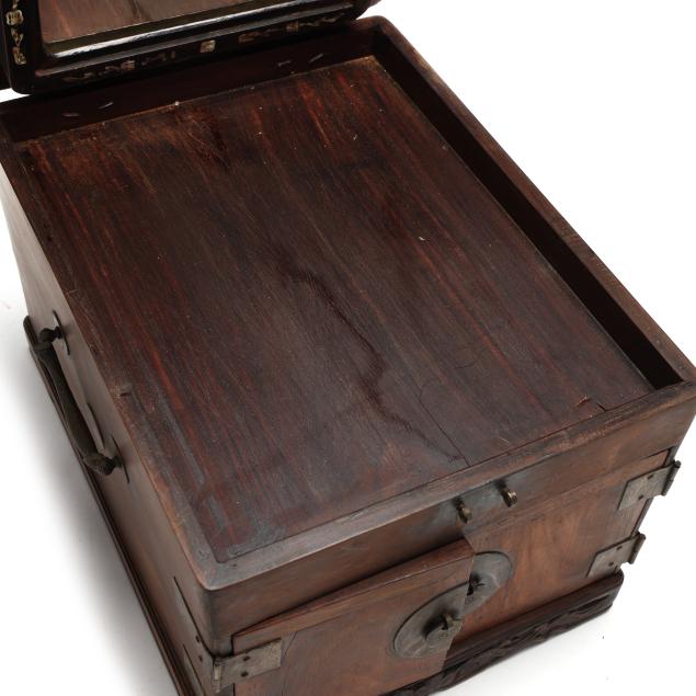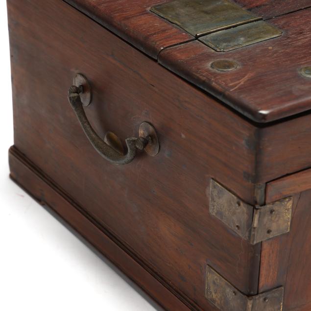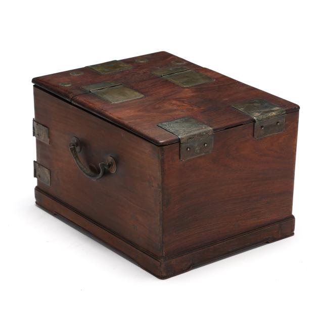 From the Estate of the late Susan C. Frankenberg, Hillsborough, North Carolina Scattered verdigris and oxidation to brass mounts and handles; small losses to mother of pearl inlay; some warping to lid; minor loss to underside of box.