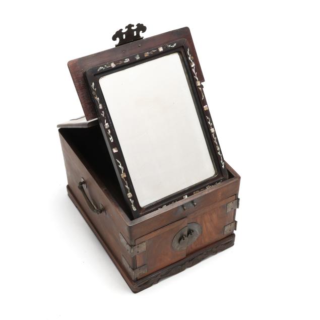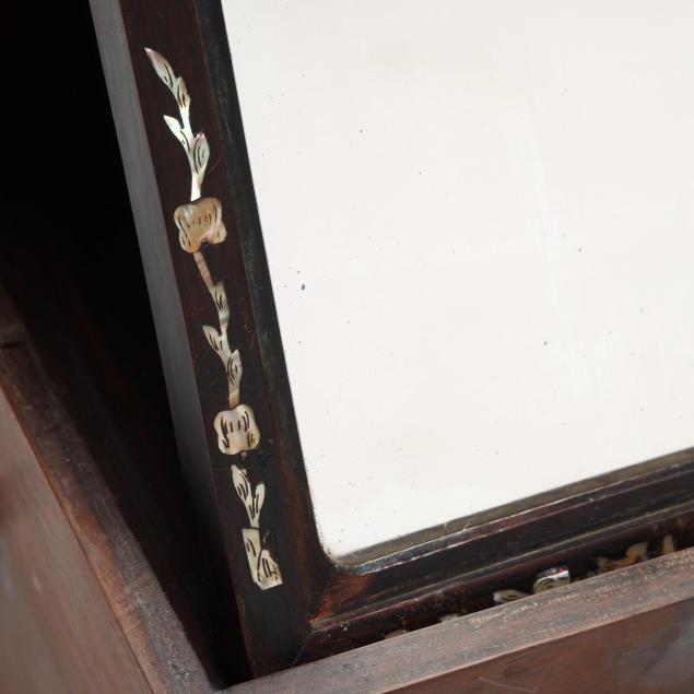 19th to early-20th century, walnut with brass mounts, doors open to reveal (4) drawers, top is lifted to reveal mirror with mother of pearl inlaid frame.