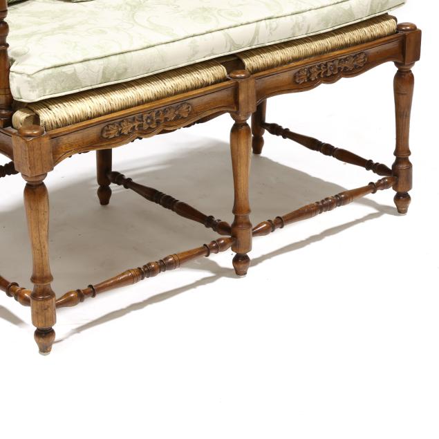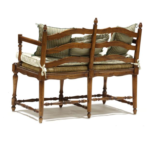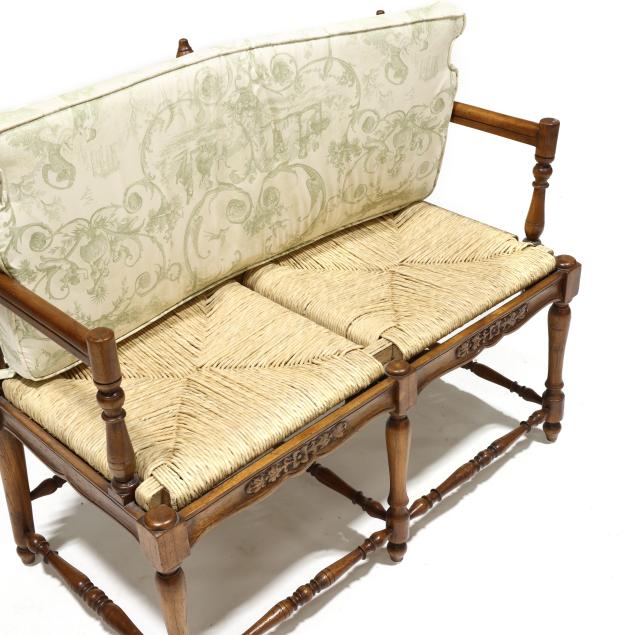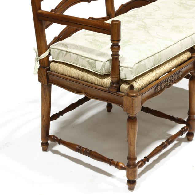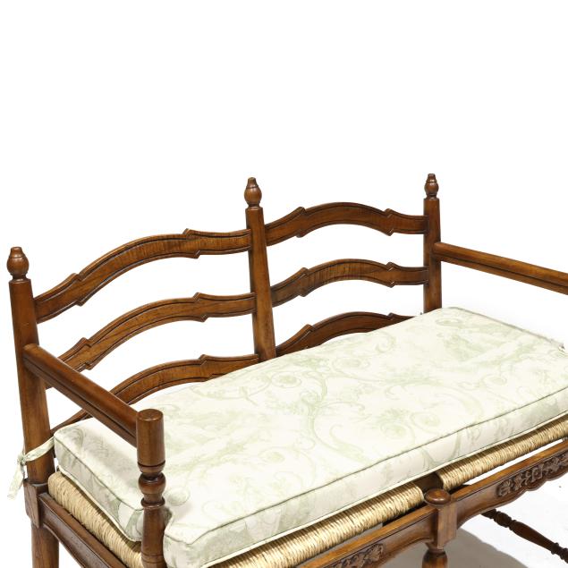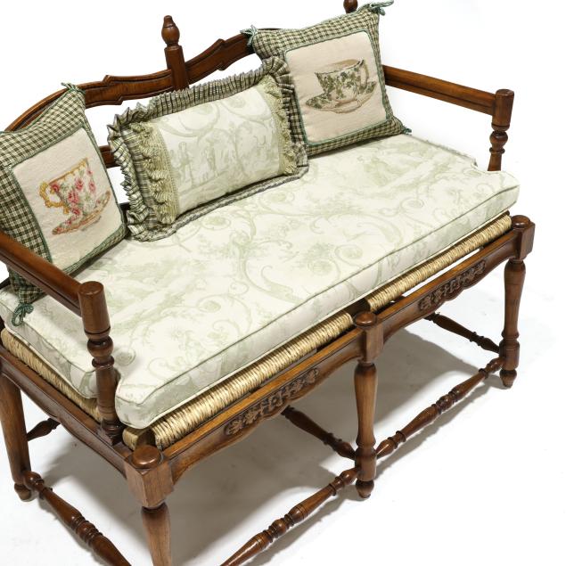 Late 20th century, double ladder back form with rush seat, green toile upholstered cushion and three throw pillows, relief carved seat rail, turned legs and stretcher base.