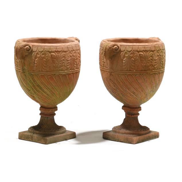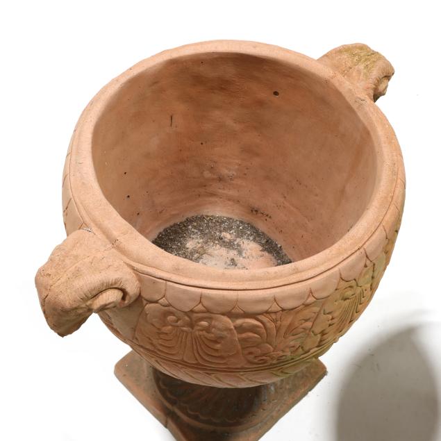 Late 20th century, one part form, ram's head handles, bas relief classical motifs, stepped square plinth, appears unmarked.