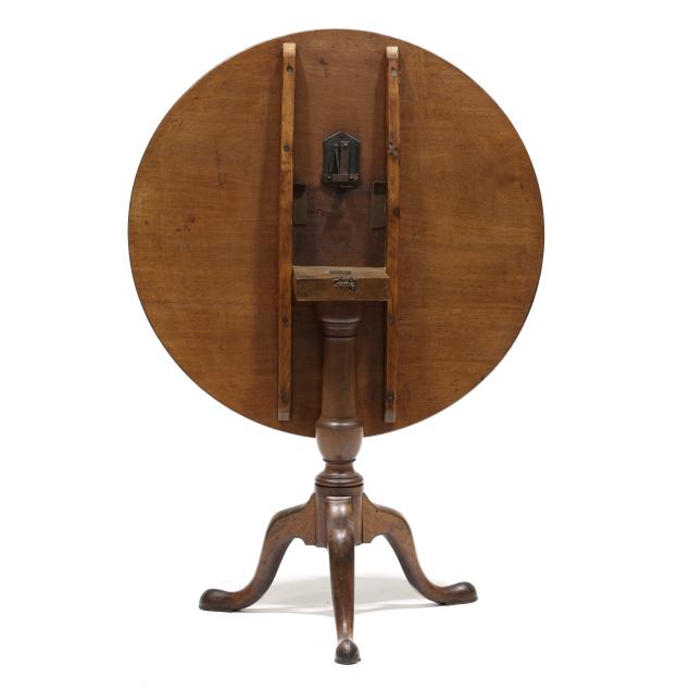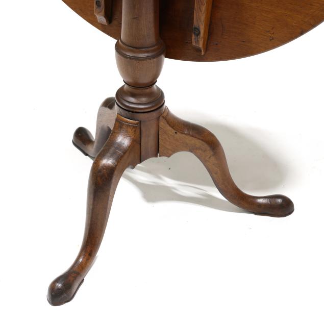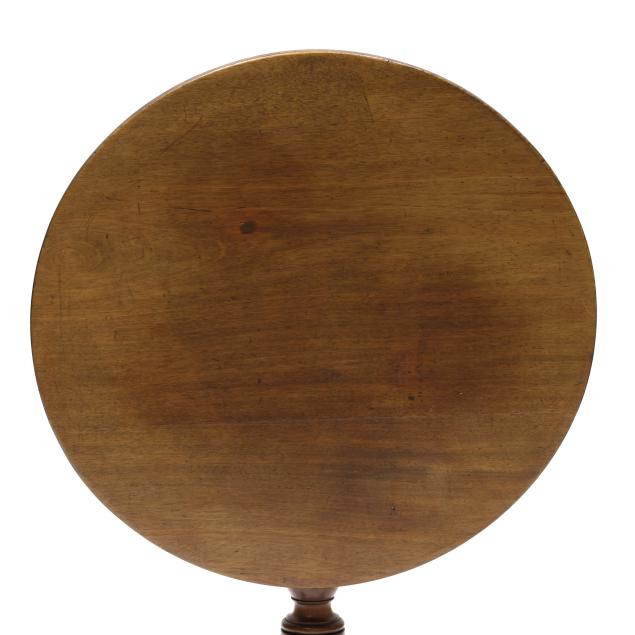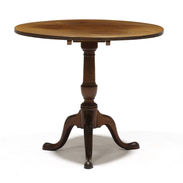 Circa 1800, circular top with reeded edge, batten and oak block support, urn turned standard, tripod base with cabriole legs on snake pad feet.