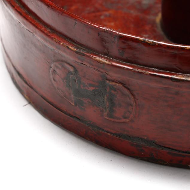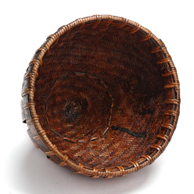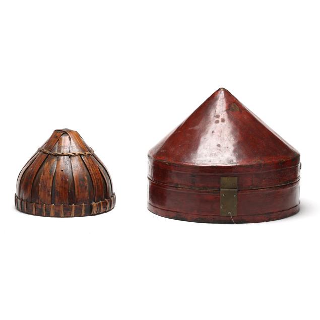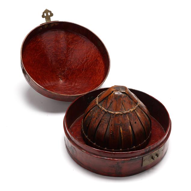 19th century, possibly Chinese, a bamboo and straw conical form hat (8 x 9 3/4 in) and a red lacquer conical form box with brass mounts (12 3/4 x 15 1/2 in.).