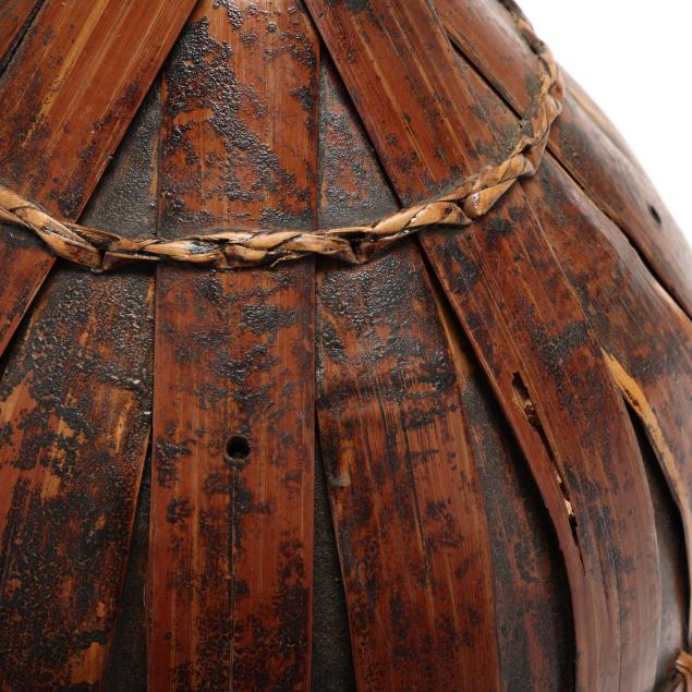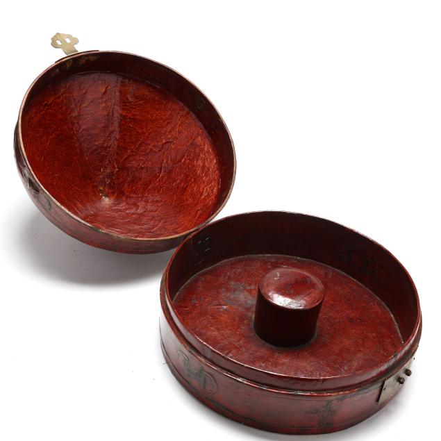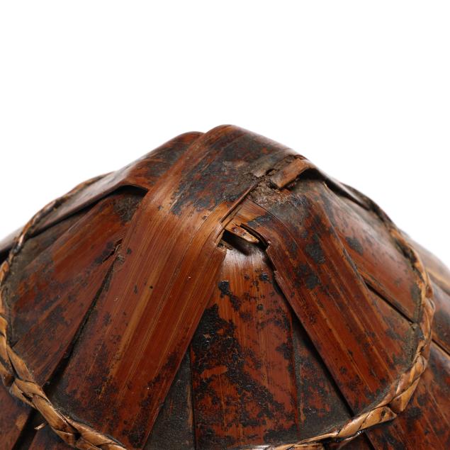 From the Estate of the late Susan C. Frankenberg, Hillsborough, North Carolina Minor loss to top of hat, bamboo with overall wear and soot residue; box with cracking to lacquer, some looseness and verdigris spotting to hinge, a few small areas of lacquer chipping, some spotting and paint flecks to exterior, warping to interior, clasp does not fully secure.