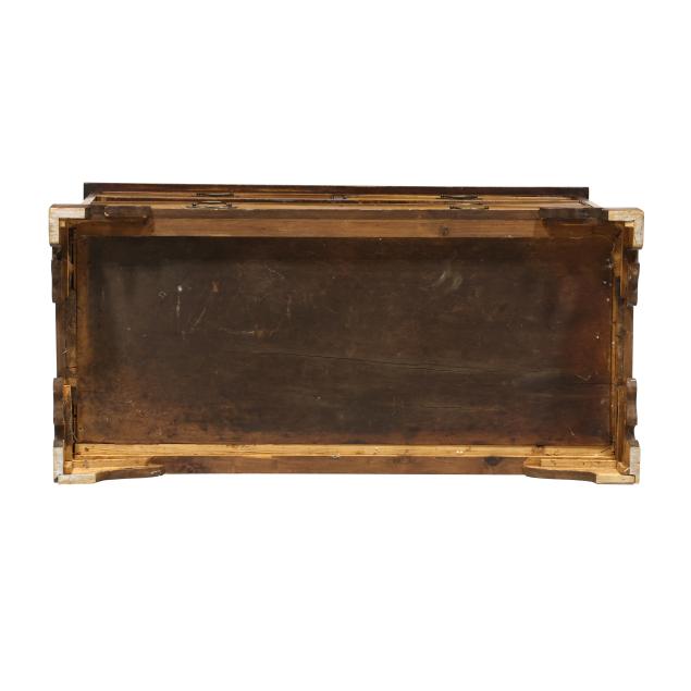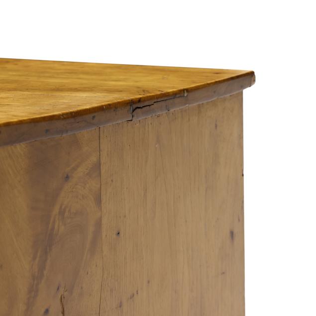 Top reset and with scratches and gouges; later pulls covering central plug holes; lower drawer with patch to upper right corner; later bracket foot base.