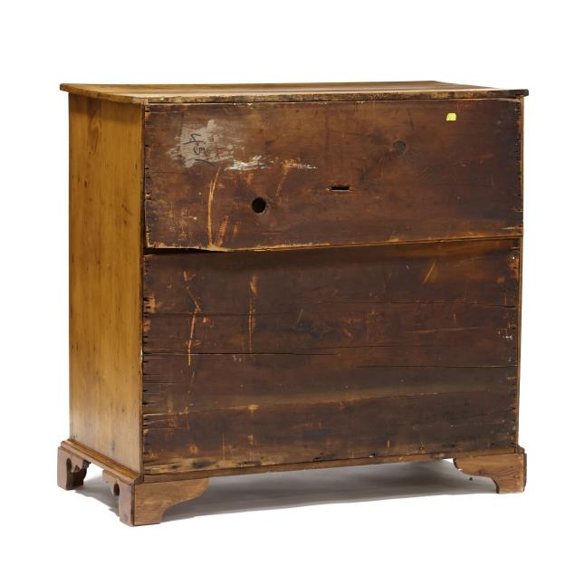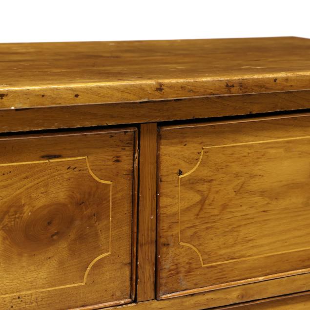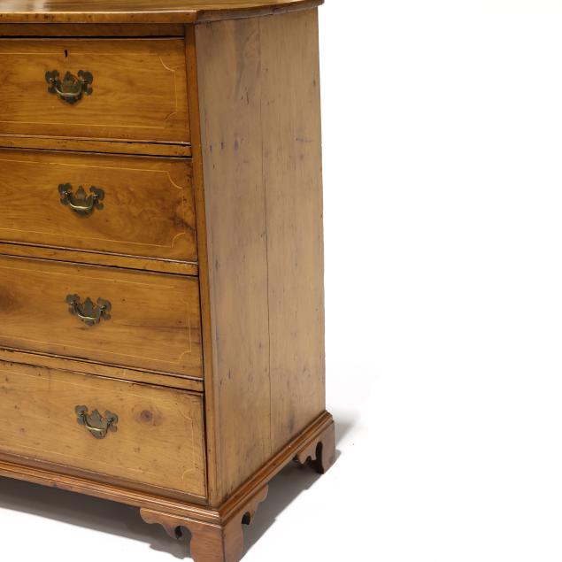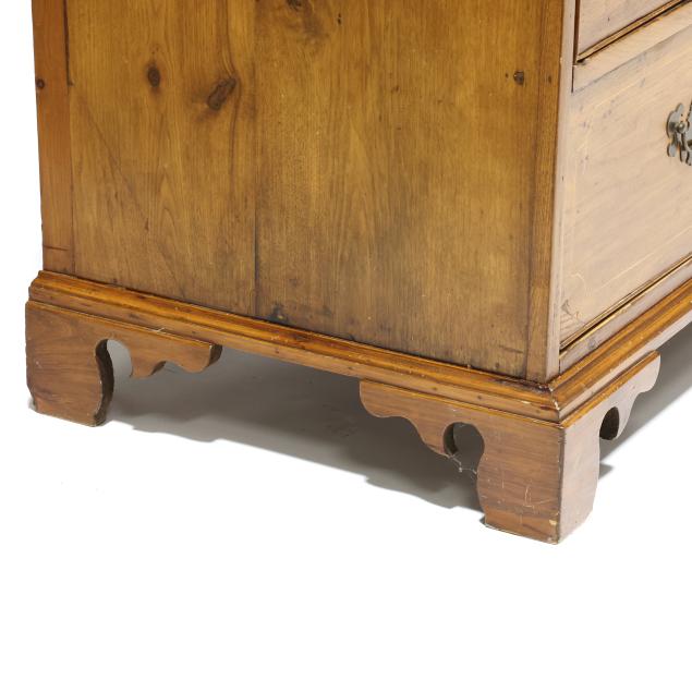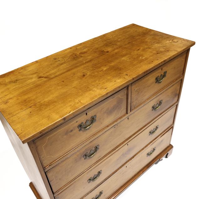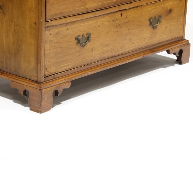 19th century, pine secondary, two over three cock beaded drawers with light line inlay, flush sides, applied straight bracket foot base.