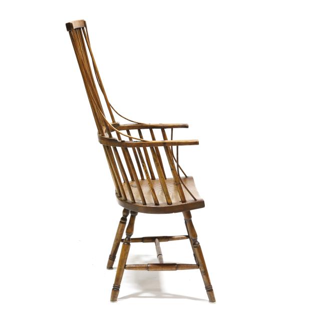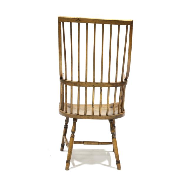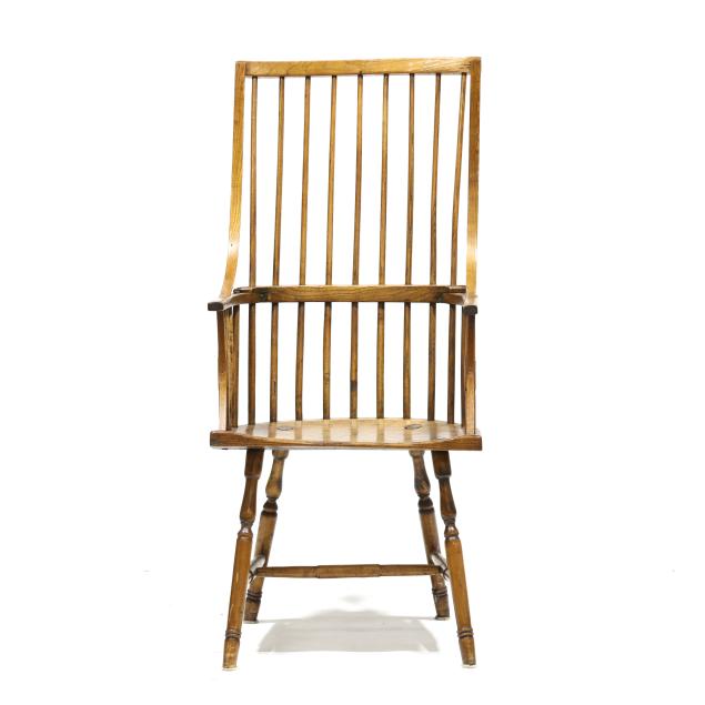 Circa 1800, elm and mixed woods, curved wood stiles and arm supports, saddle seat with through tenon splayed turned legs and stretcher base.