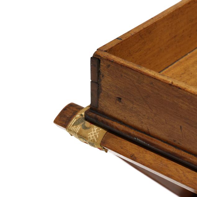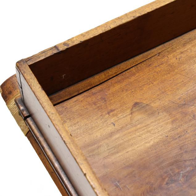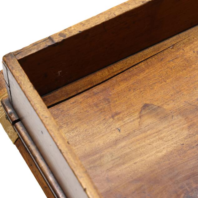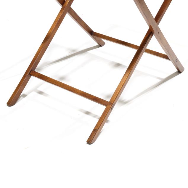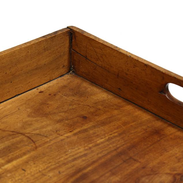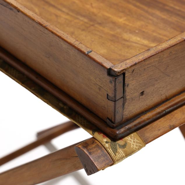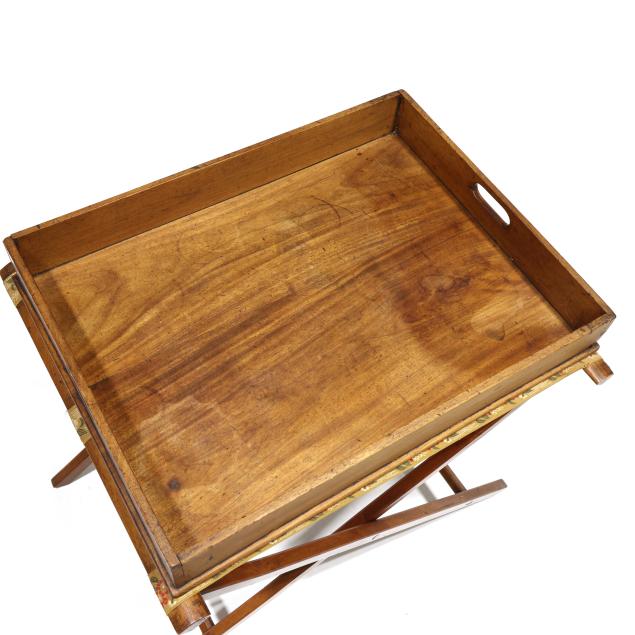19th century, dovetailed tray with pierced handles, set on a folding mahogany stand.