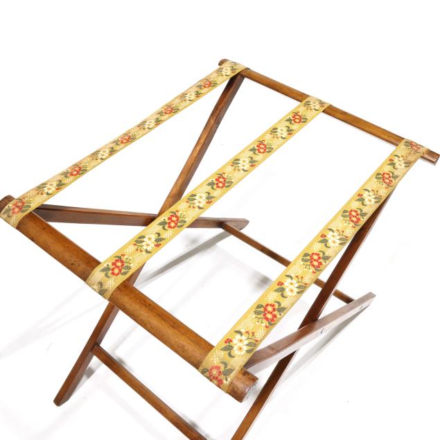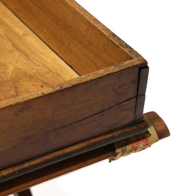 Tray with staining and one shrinkage crack; stand is old but later with areas of separation to fabric straps; joint looseness.