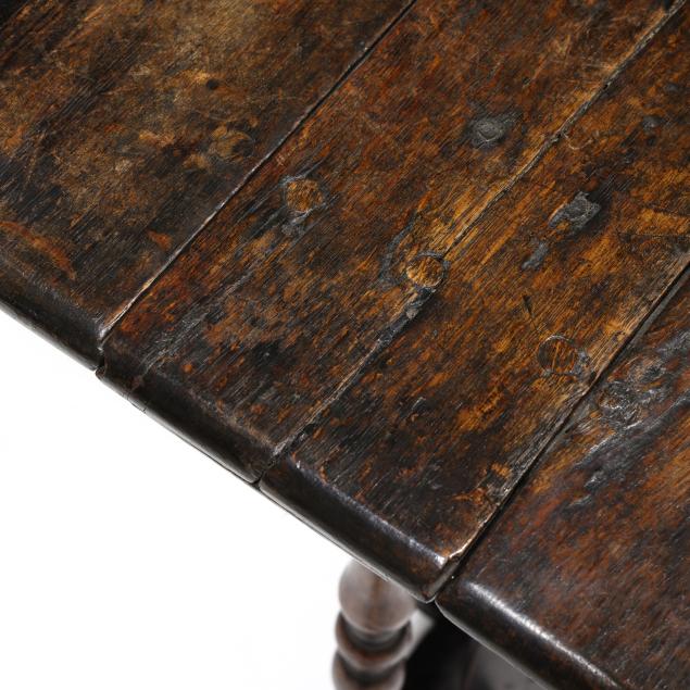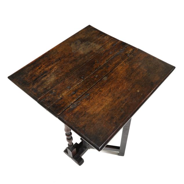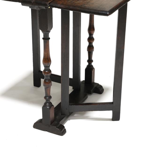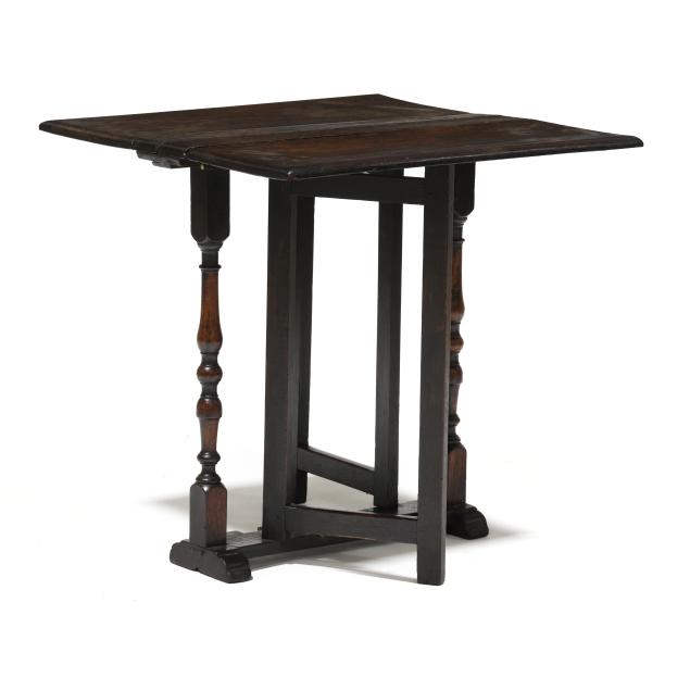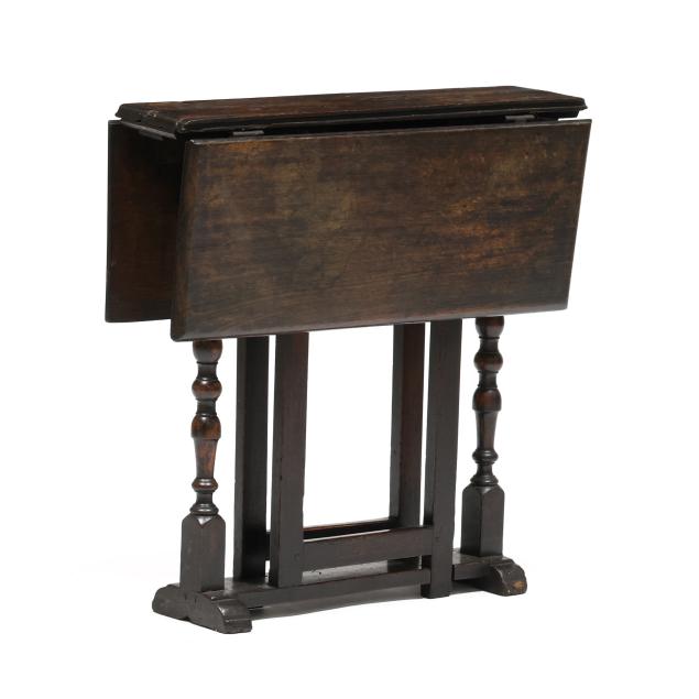 19th century, top with rounded edge, single gate-leg support, turned legs with stylized shoe feet.