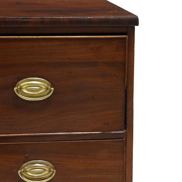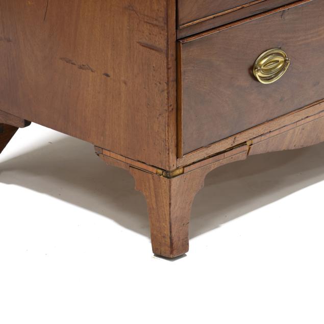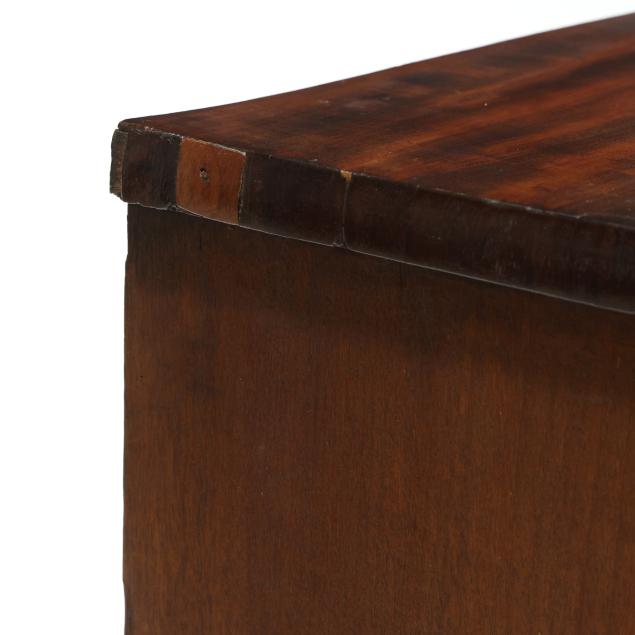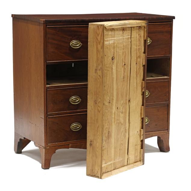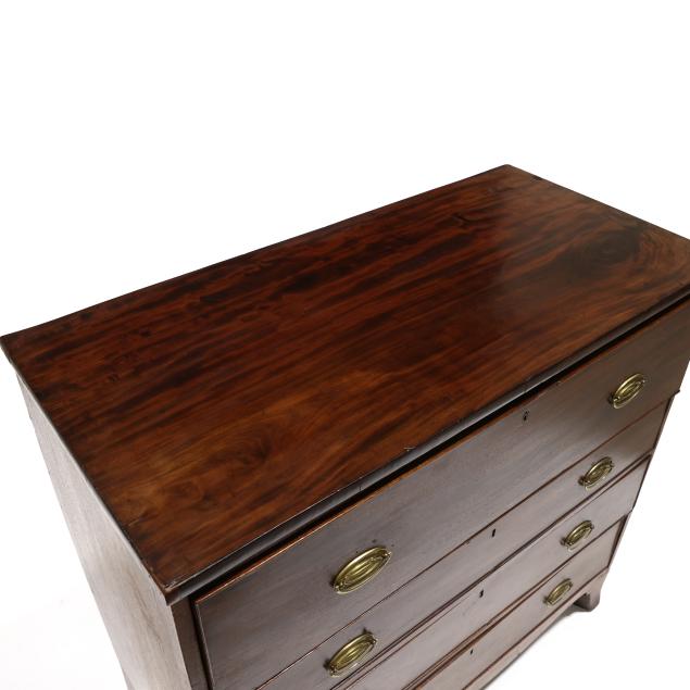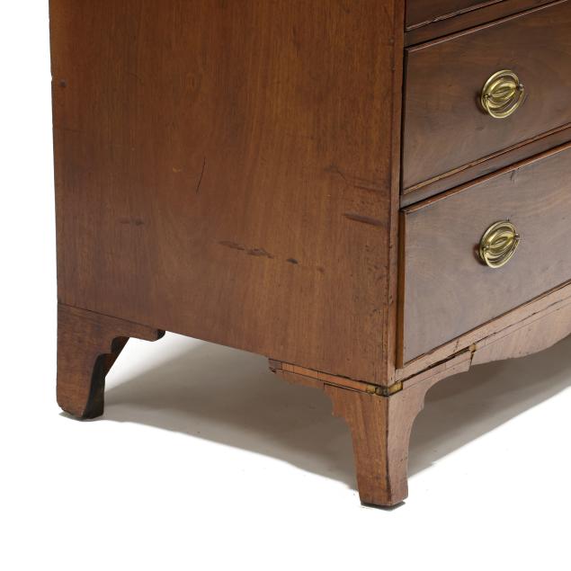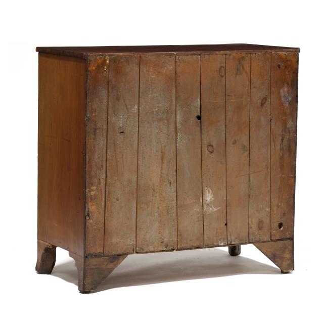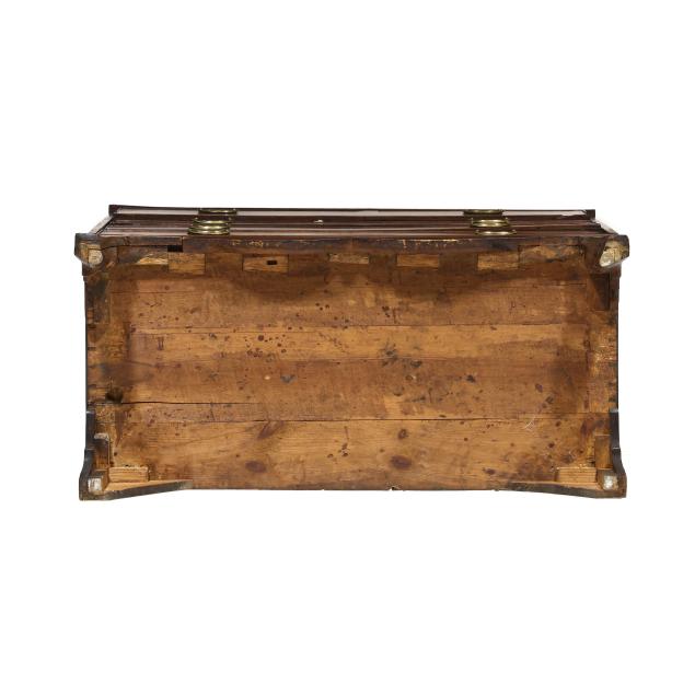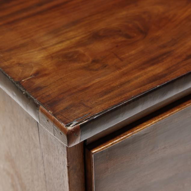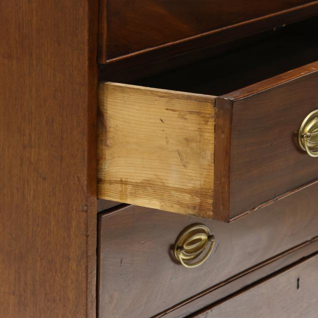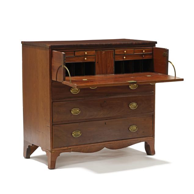 From the Estate of Dr. Charles & Shirley Herring, Kinston, North Carolina Top with scratches and indents; some small veneer patches; interior prospect door is detached; some interior pulls with loss; later brass pulls covering central hole; some cock beading loss; area of veneer loss at skirt; feet are old and appear original; however, the front left foot is detached.