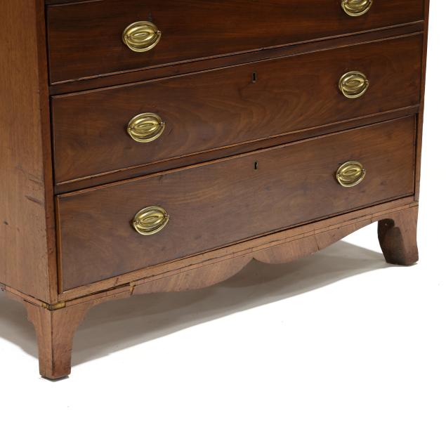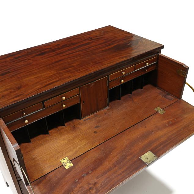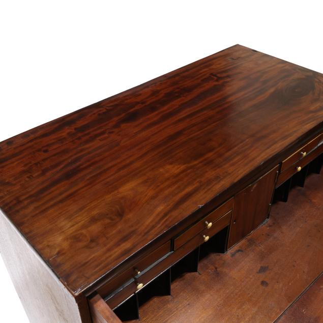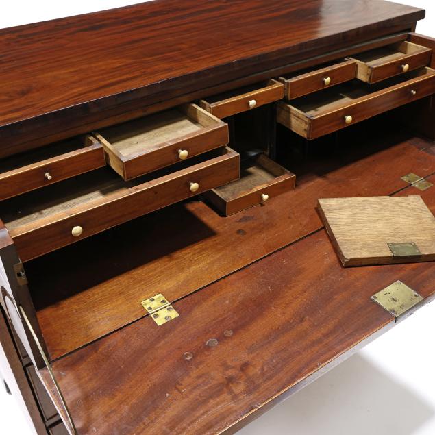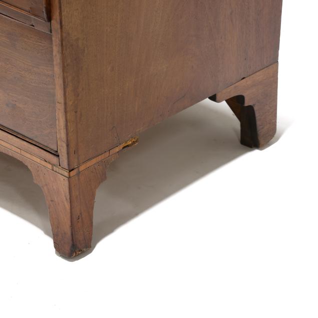 Circa 1800, mahogany, mahogany veneer, oak and pine secondary, top with vertically veneered edge, fall front upper drawer, interior with central prospect door with two interior fitted drawers, six small drawers and eight pigeonholes, the case with three graduated cock beaded drawers, French bracket feet.