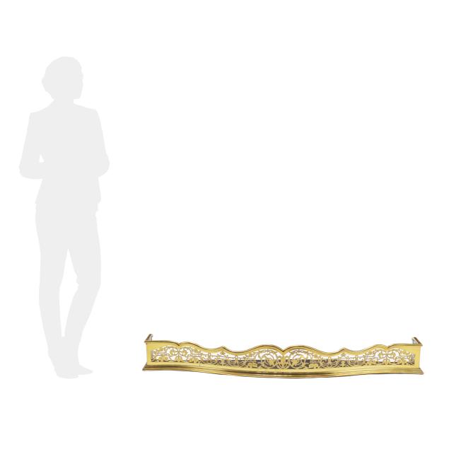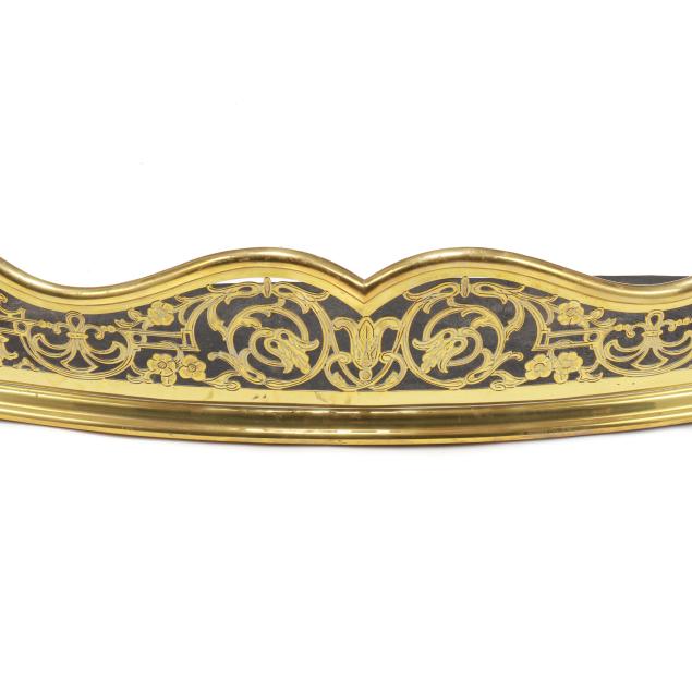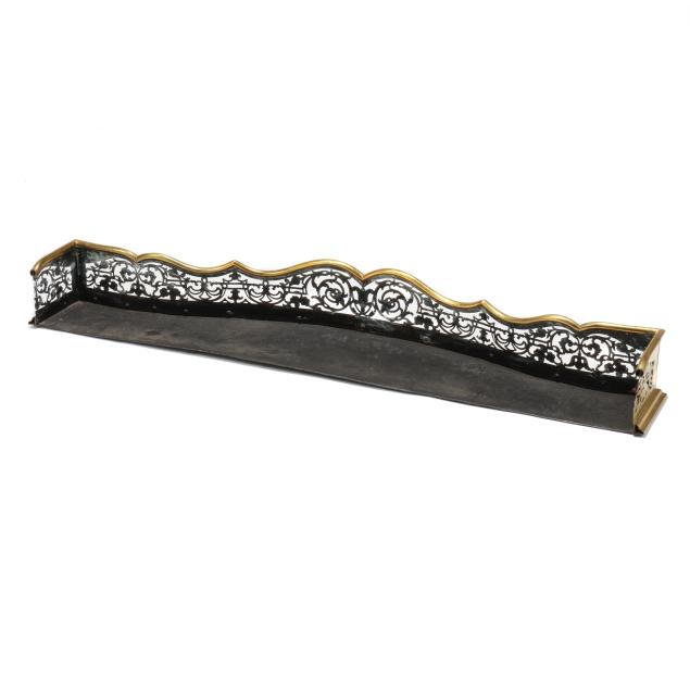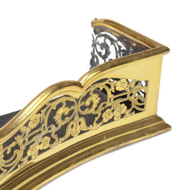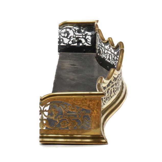 Late 19th century, serpentine form with pierced and chased brass panels, black painted iron base plate.