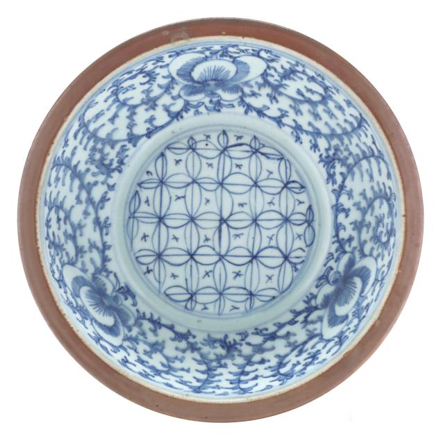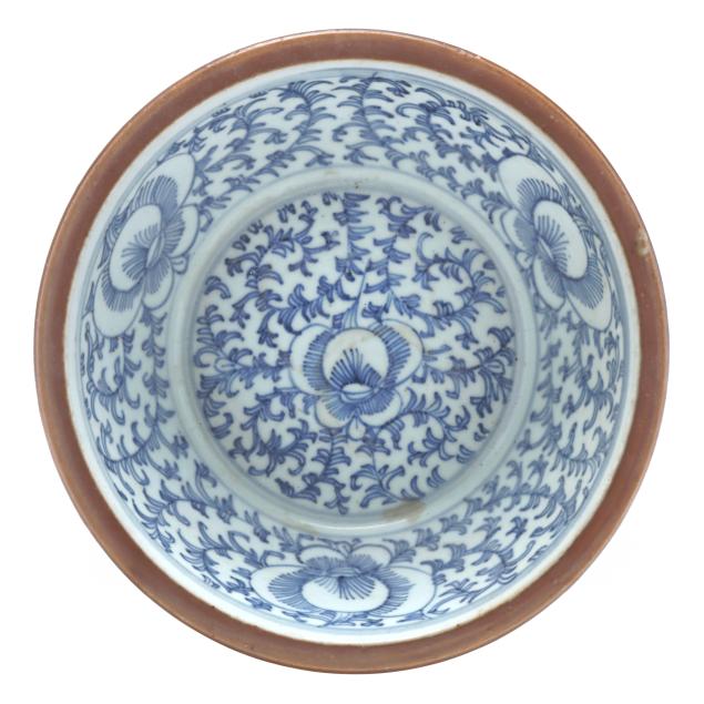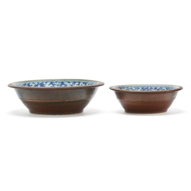 20th century, each porcelain bowl with deep rounded sides rising from a short ring foot to an everted broad rim, the interior decorated in underglaze blue with lotus scroll, the rim and exterior covered in a chestnut brown glaze.