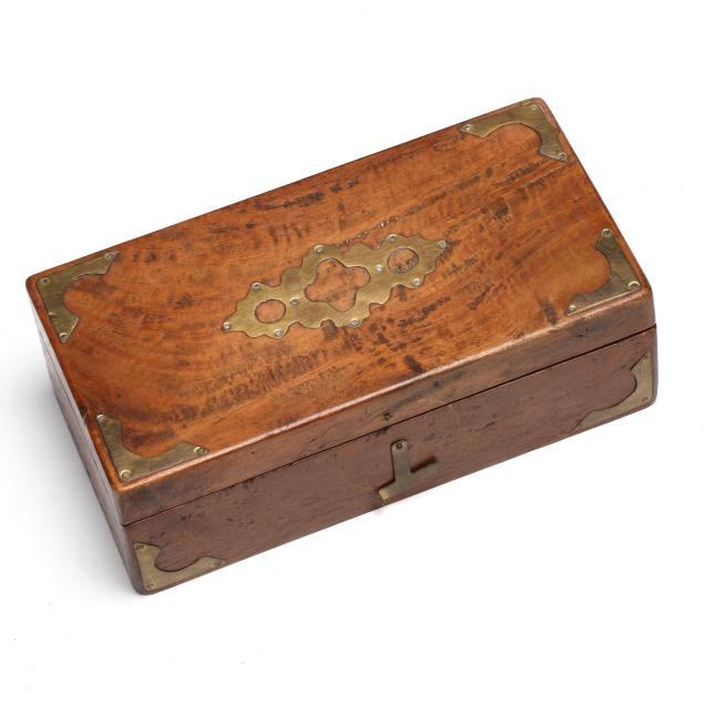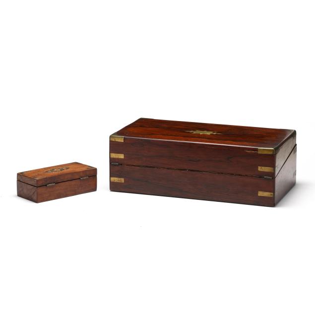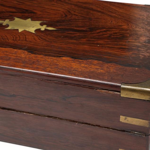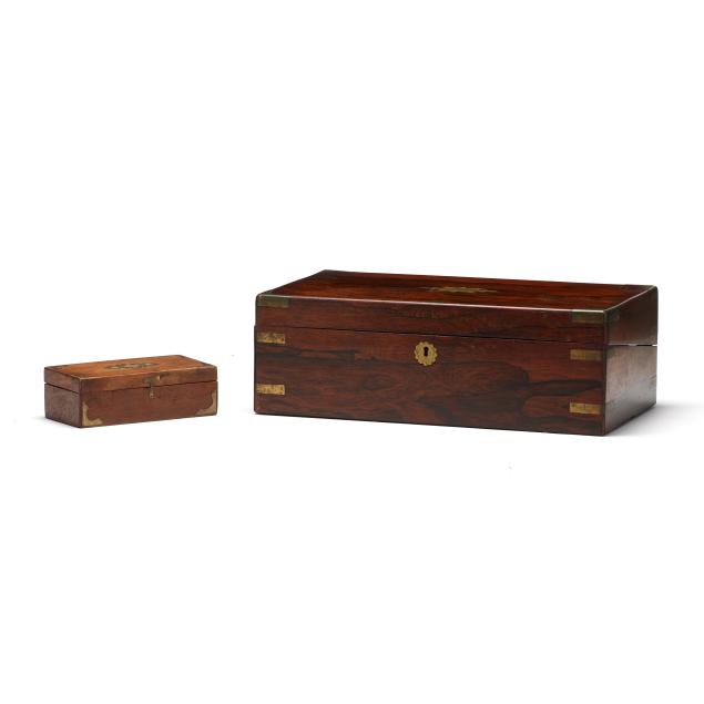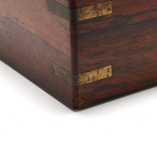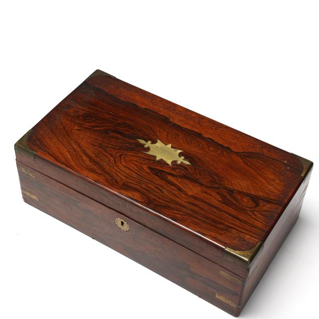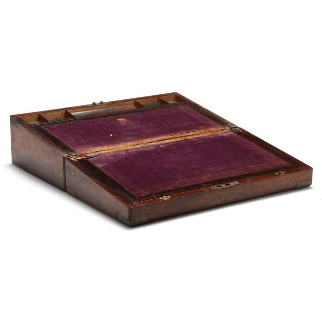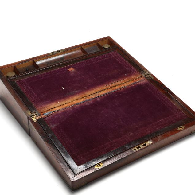 Late 19th century, the lapdesk with rosewood veneers and mahogany secondary, unmarked, inlaid brass strap mounts and escutcheon, opening to an aubergine velvet writing service with further letter storage beneath, and five pen and ink compartments, including two brass capped inkwells (6 1/4 x 18 x 10 in.); the traveling set of brass weights likely for apothecary or jewelry merchant trade, includes (8) graduated weights measured in grams, fitted within a burl case with brass mounts.