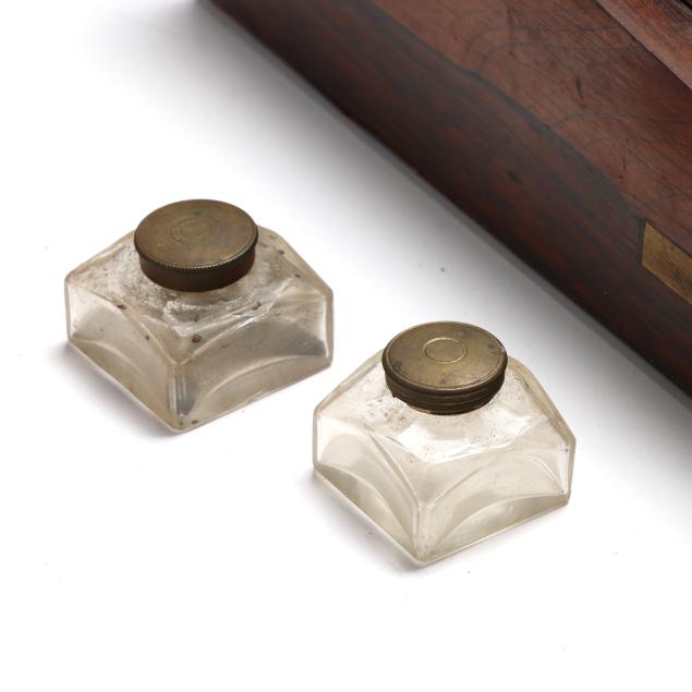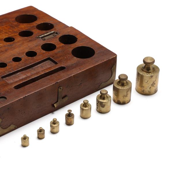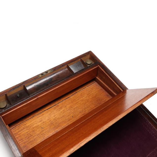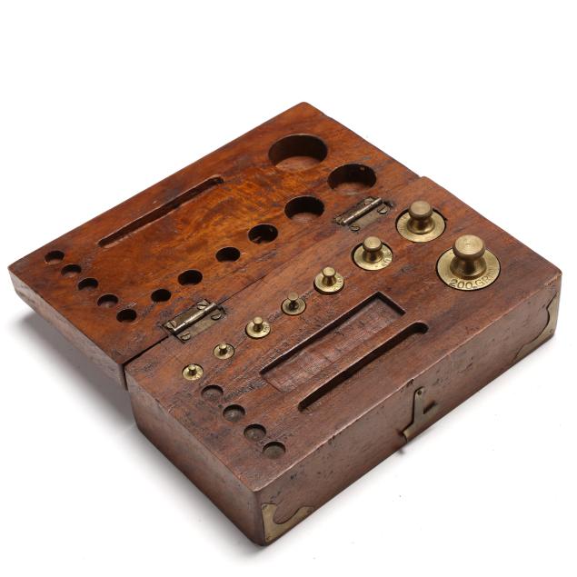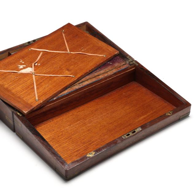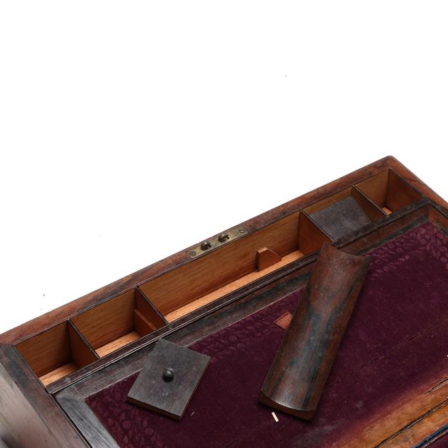 From the Estate of the late Susan C. Frankenberg, Hillsborough, North Carolina Case with scratches, a few cracks, and small losses to veneers; writing service and letter storage bands with some tears and losses; one interior panel loose with loss to one brass stay clip; ink bottles are period with some staining. Weight case missing several weights and scale accoutrements.
