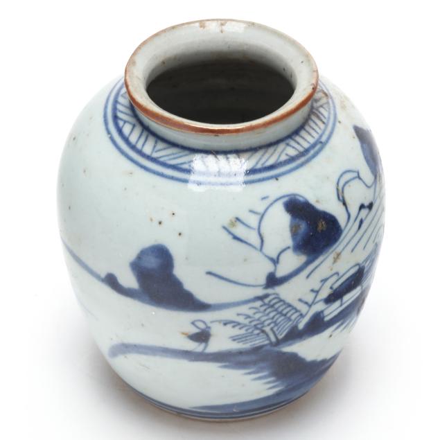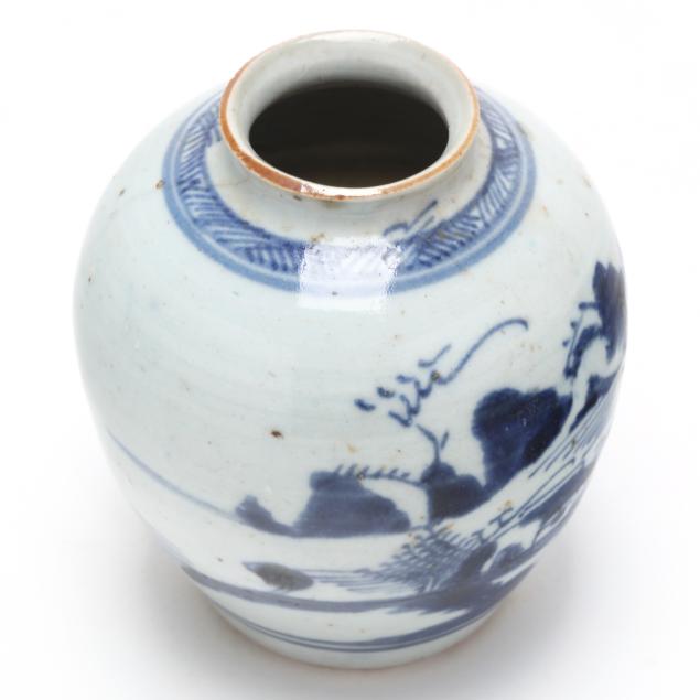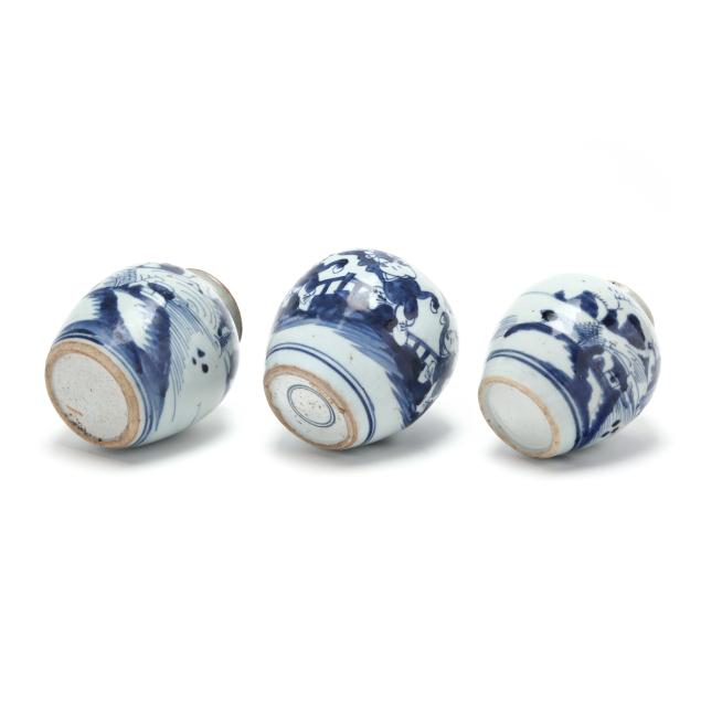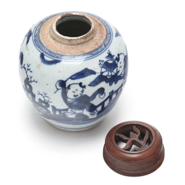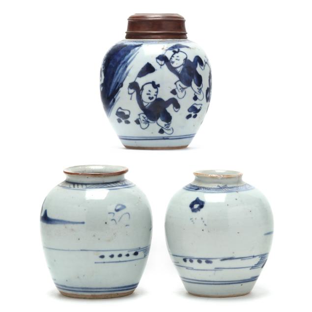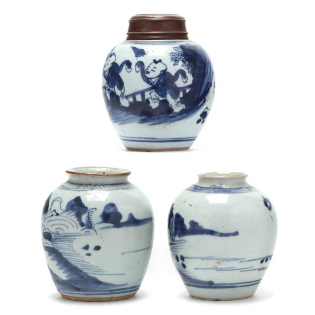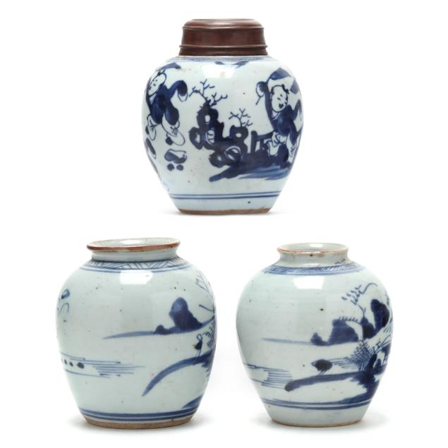 Late 19th and 20th century, globular porcelain jars hand painted in underglaze blue, the first with two dancing boys, double blue rings to underside, comes together with a carved reticulated wood cover, the other two jars with curled rim and hand painted with a hazy landscape.
