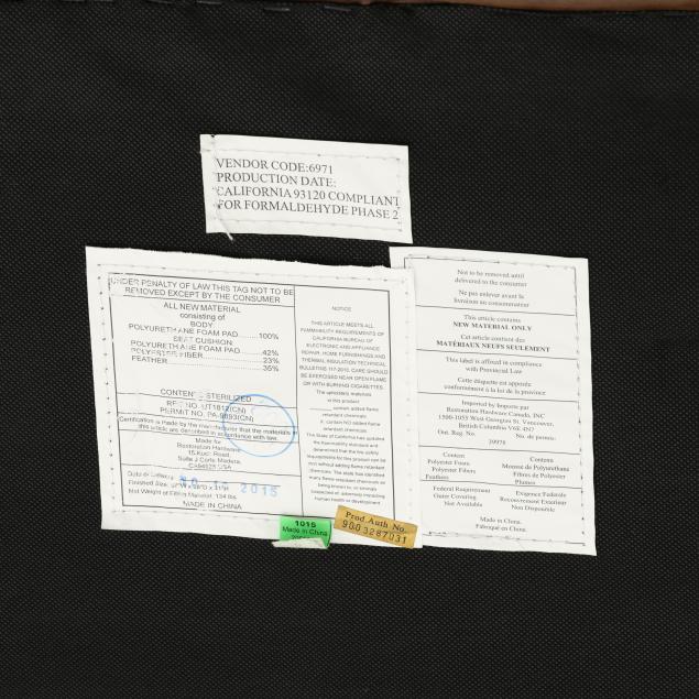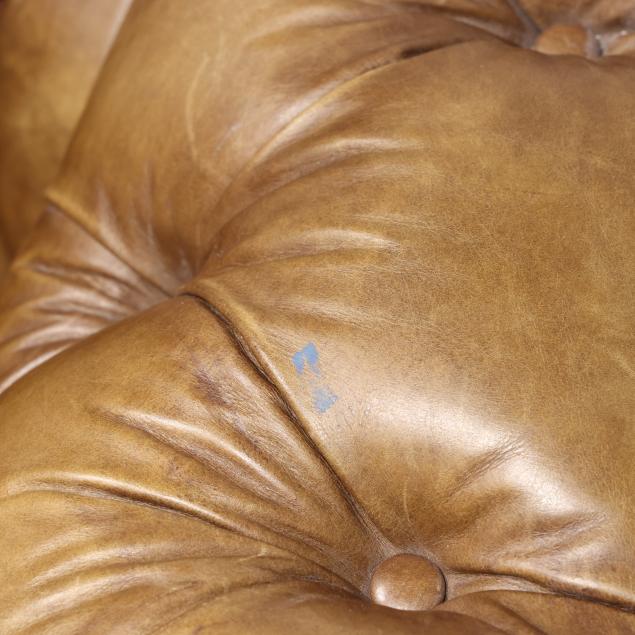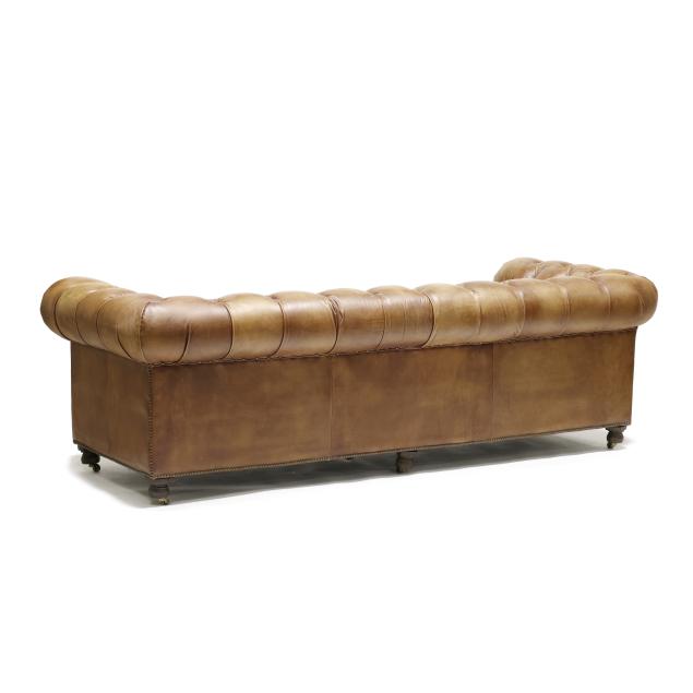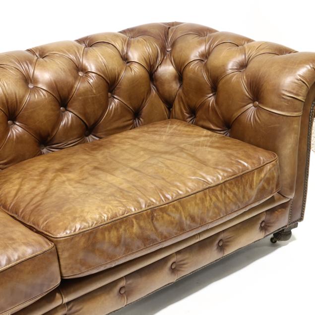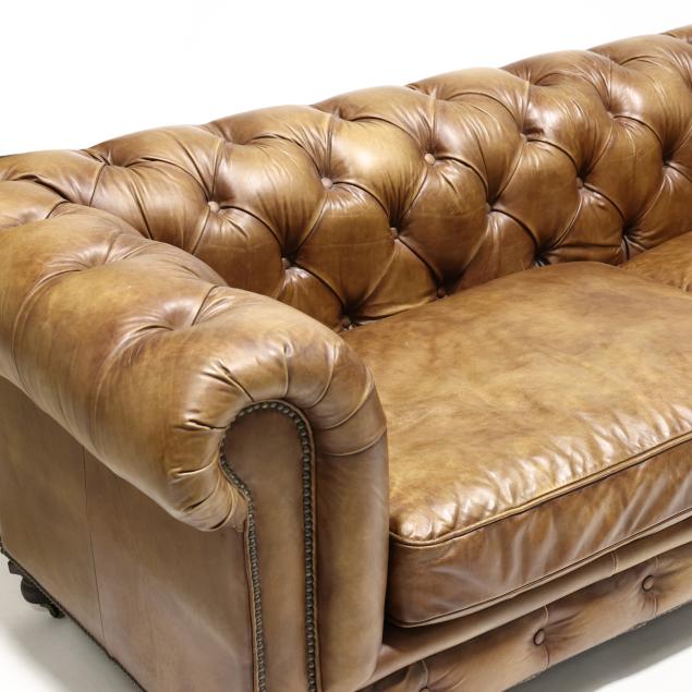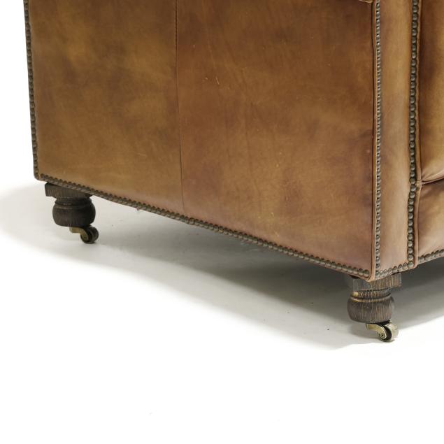 Late 20th century, brown leather with rolled and tufted back and arms, two loose seat cushions, ebonized oak feet on casters, labeled.