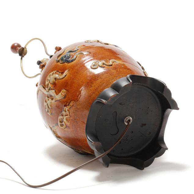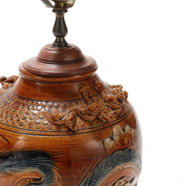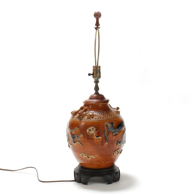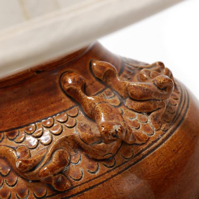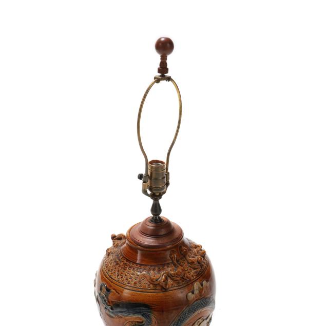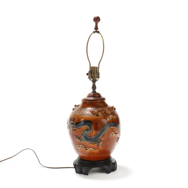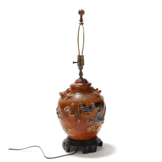 20th century, a large brown glazed ovoid form jar with bas-relief cobalt blue glazed dragon and swirling cloud decoration to body, incised scalloped decoration to shoulder with applied decorative swirling cloud form handles, mounted to carved wood base, wood mount, wood ball finial, and silk shade, unmarked.