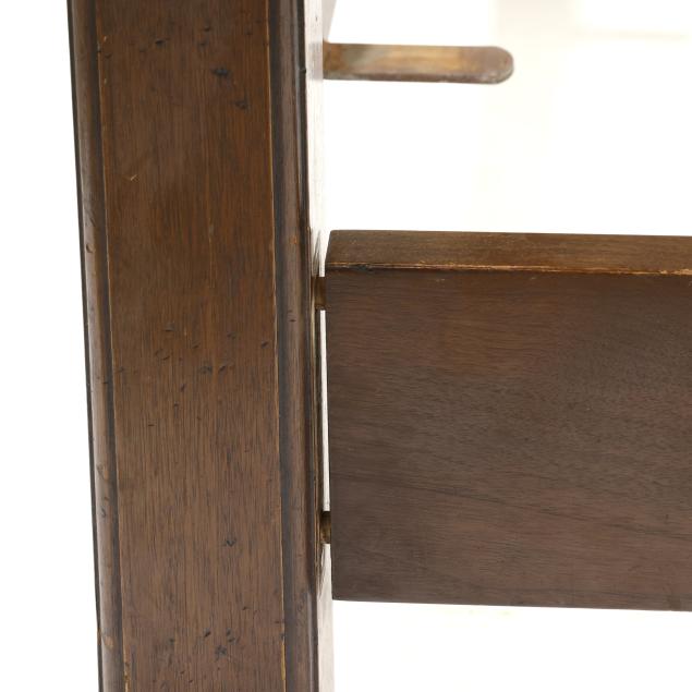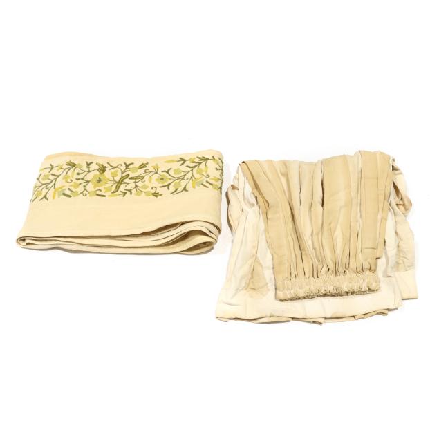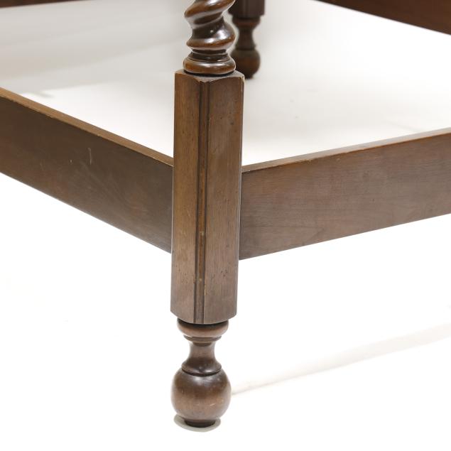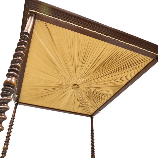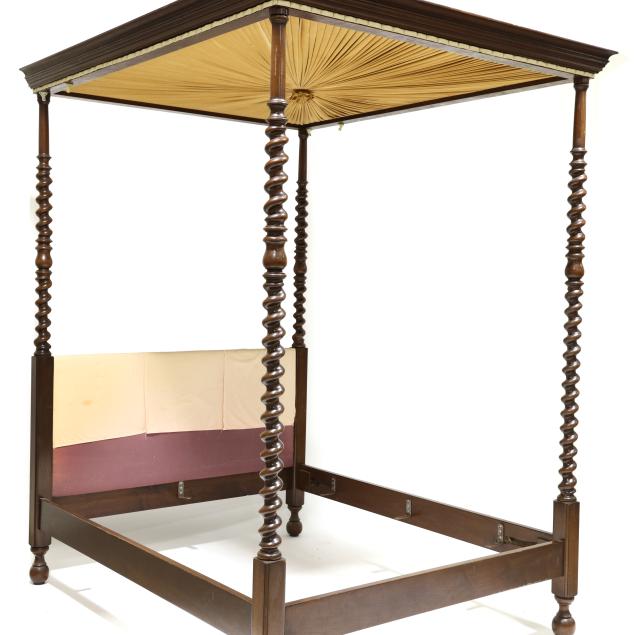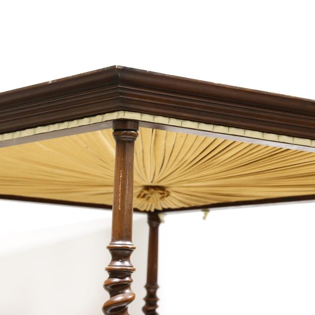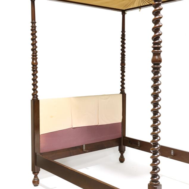 Mid-20th century, molded edge and upholstered tester set on four tall spiral turned posts, upholstered panel headboard, with wood rails; accompanied by a fitted boxspring (optional to the buyer) which can allow for a full or queen size mattress.