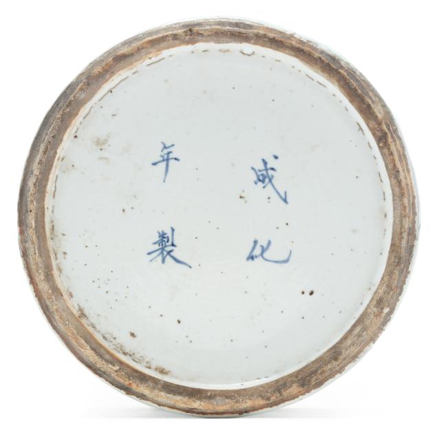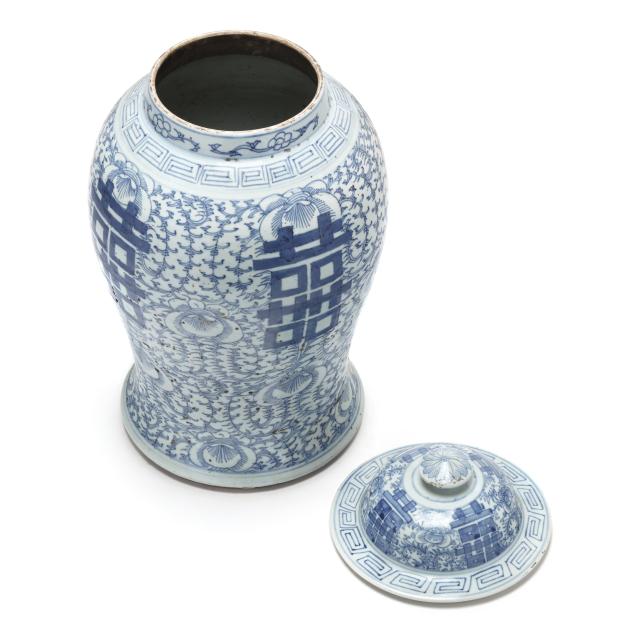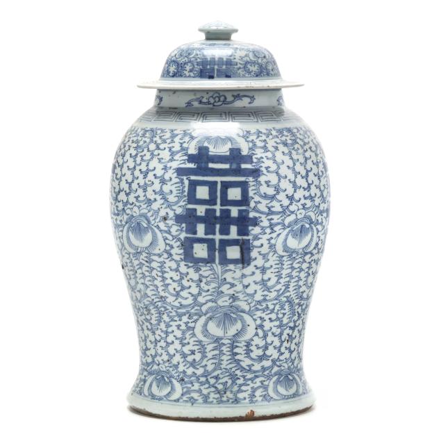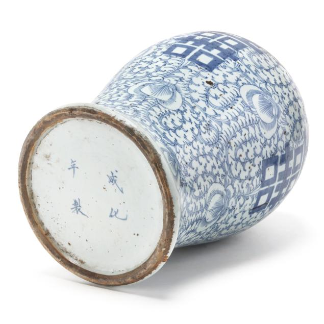 Early 20th century, hand painted porcelain with peony and scrolling vine decoration on body and cover in cobalt blue, four double happiness symbols on the body and on the cover, key motif surrounds the upper body and along the rim of the cover, four character apocryphal Chenghua mark to underside.