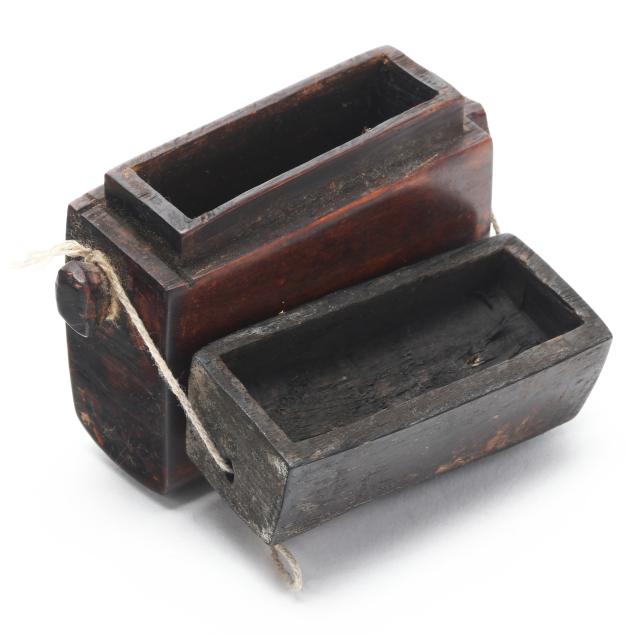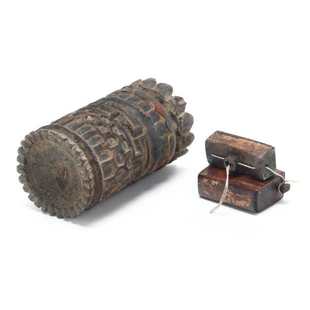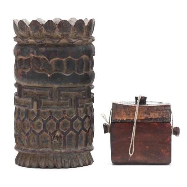 20th century, a wood pot carved with geometric patterns and a box with cover that is connected and secured with a rope.