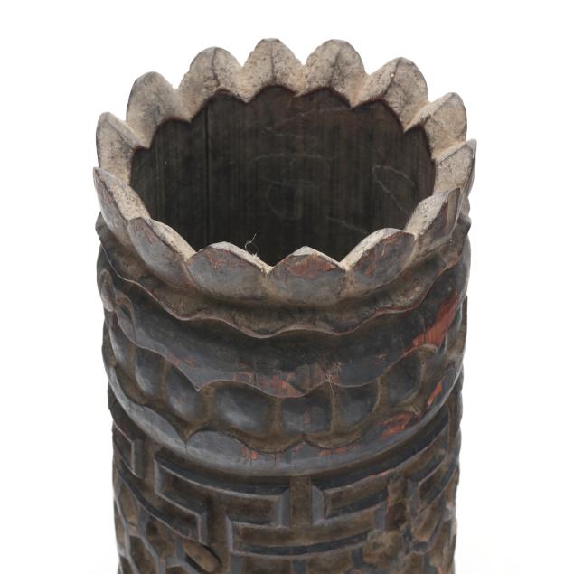 A Southeast Asian Carved Wood Brush Pot and Carrying Box