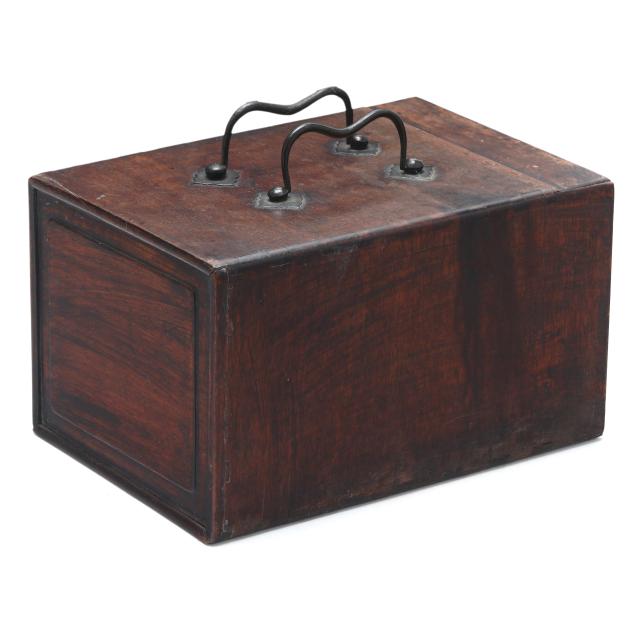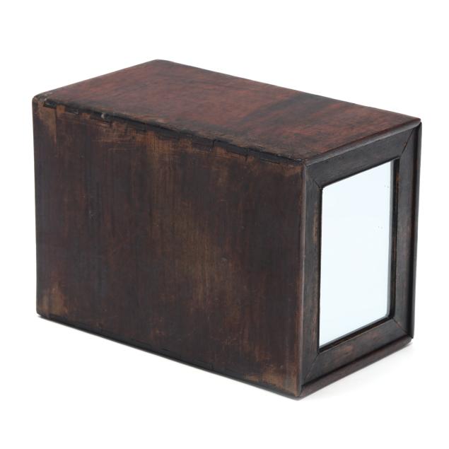 19th century, rosewood box with two metal handles, sliding door to one side with mirror opens to reveal (2) drawers with brass pulls and a second pull out mirror.