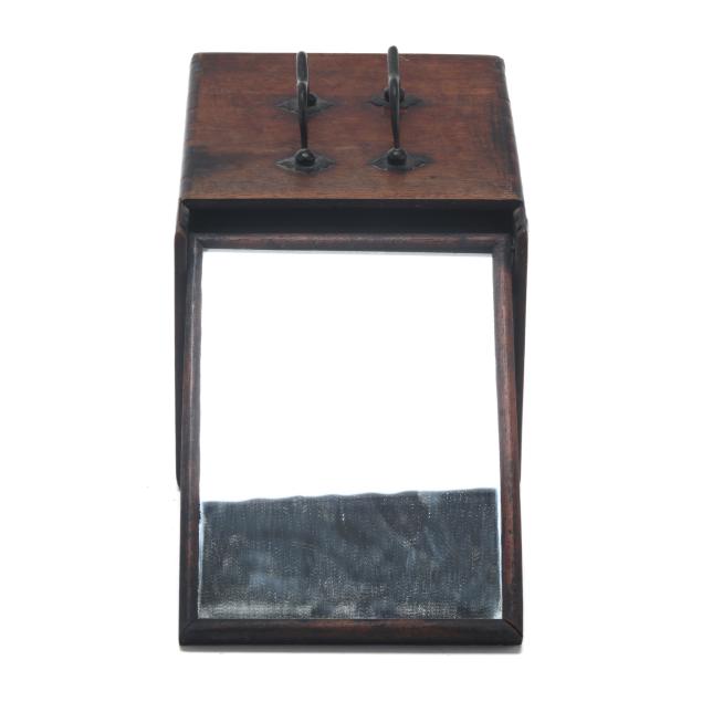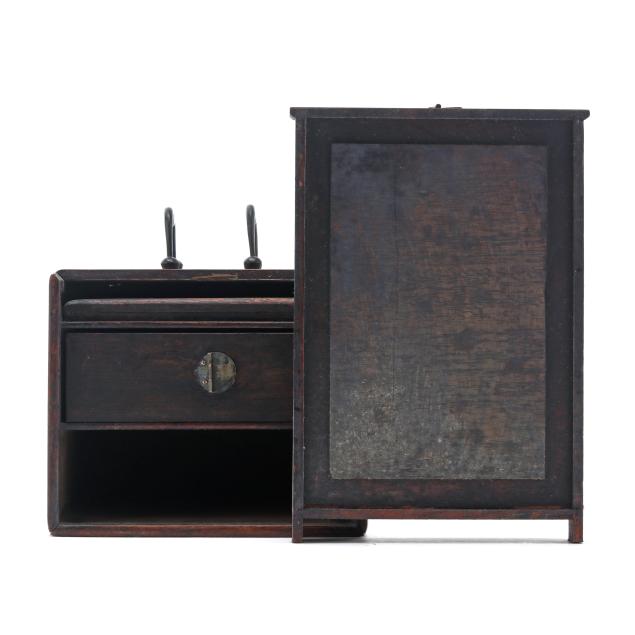 From the Estate of the late Susan C. Frankenberg, Hillsborough, North Carolina Scattered spotting to interior; stiffness to top drawer pull; new mirror attached to one element with tape; scuffs and scratch marks to underside and base; crack to base.