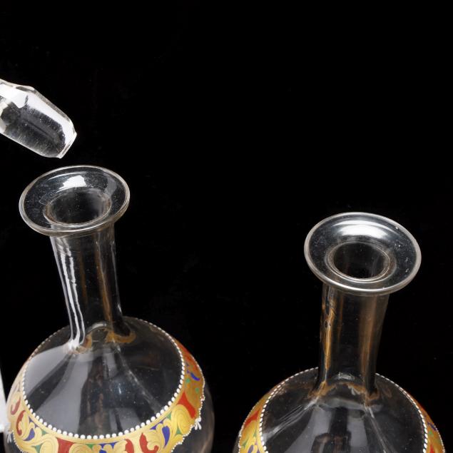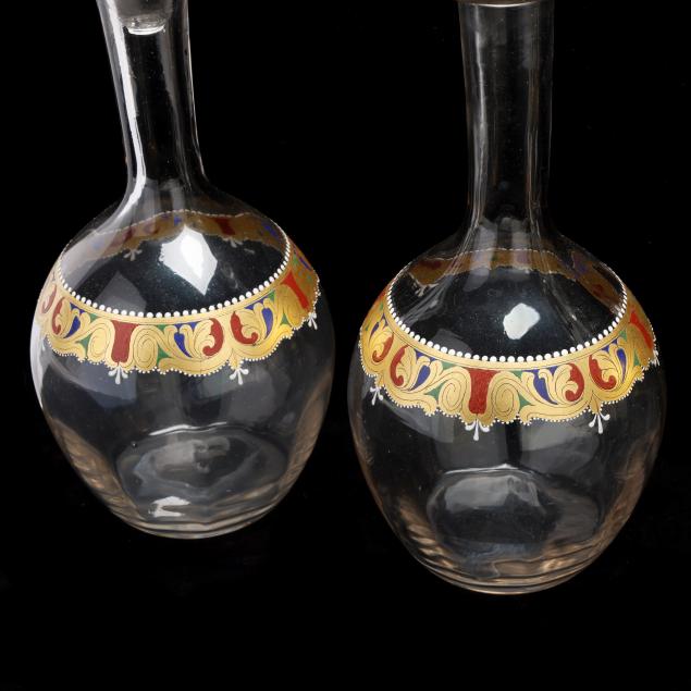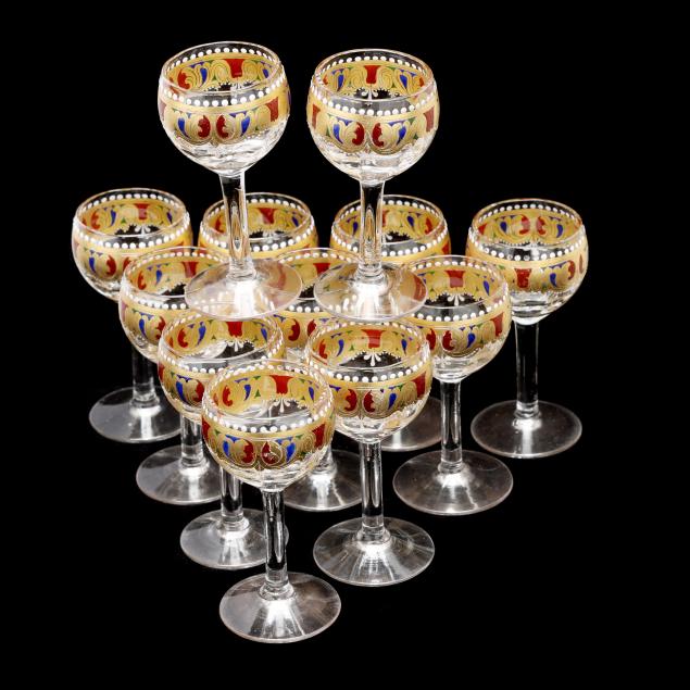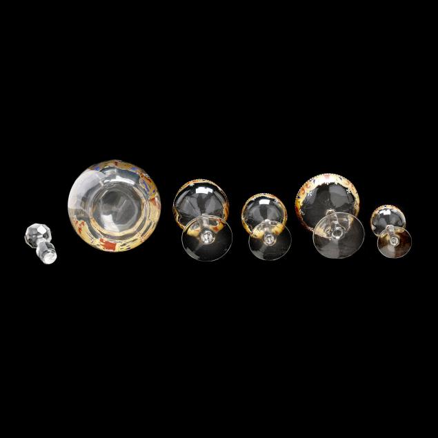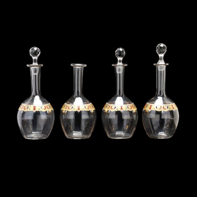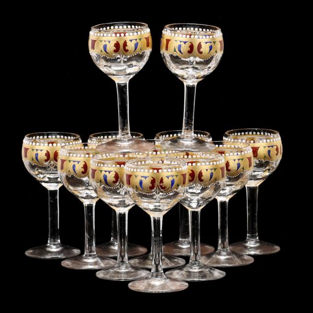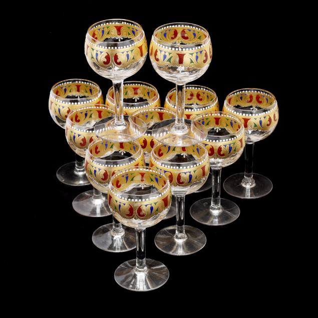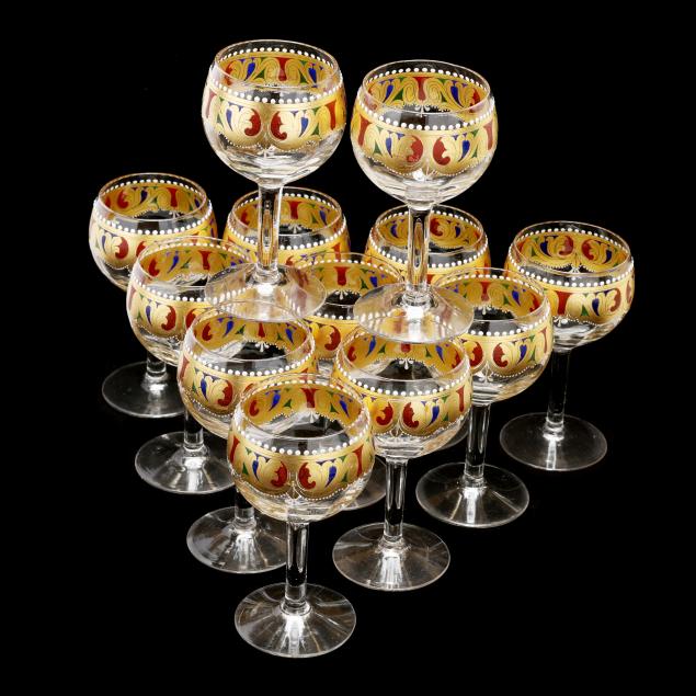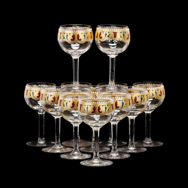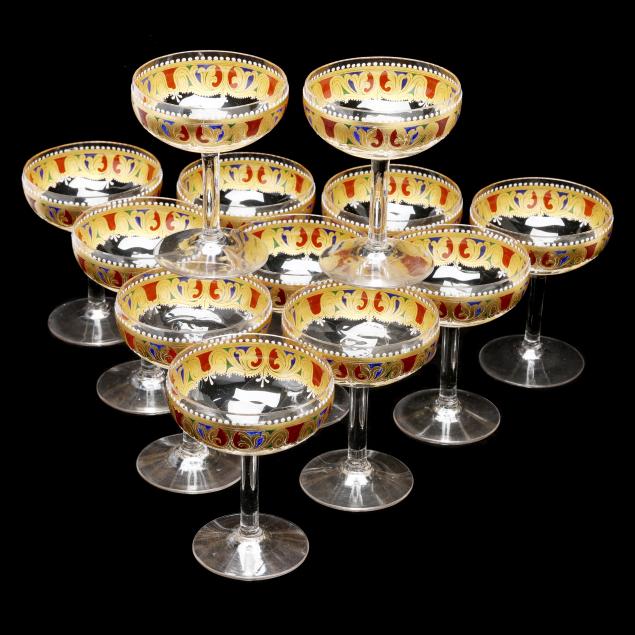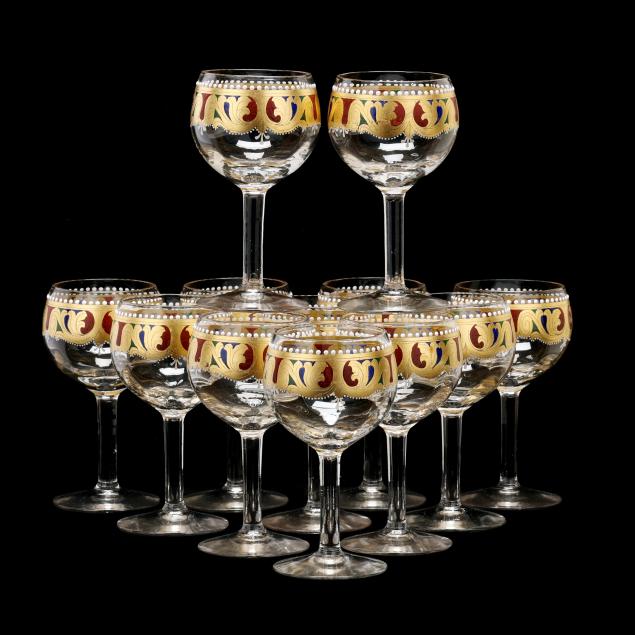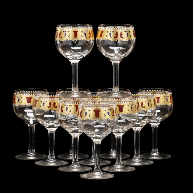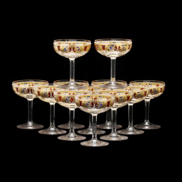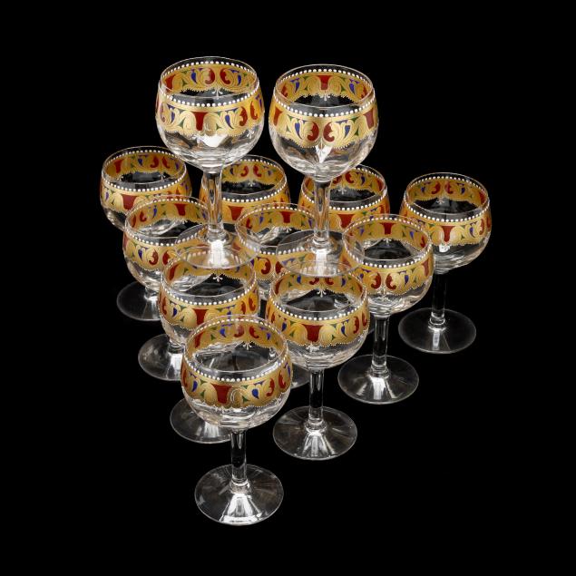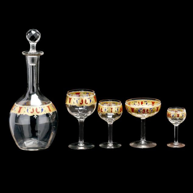 First half 20th century, including (4) decanters (13 in.); (12) water goblets (6 in.); (12) red wines (5.25 in.); (12) white wines (4.75 in.); (12) sherries (4 in.); (12) champagne coupes (4.75 in.), some marked with an etched "L" to the underside.