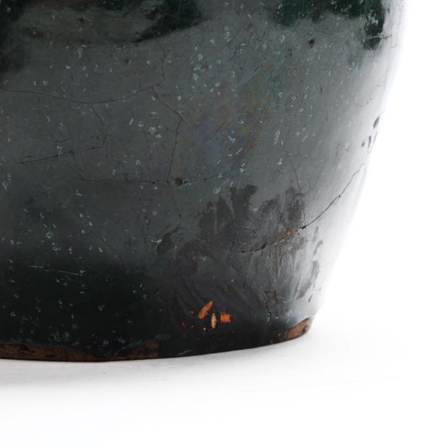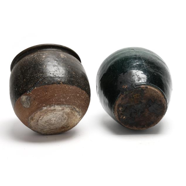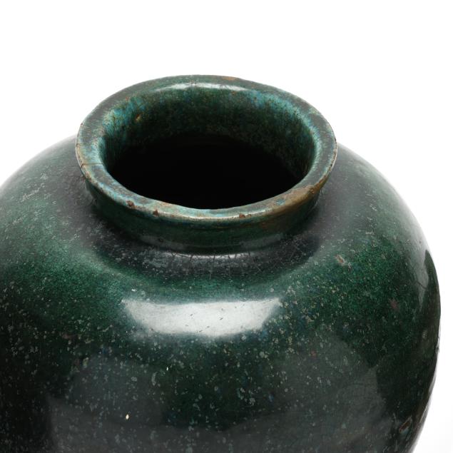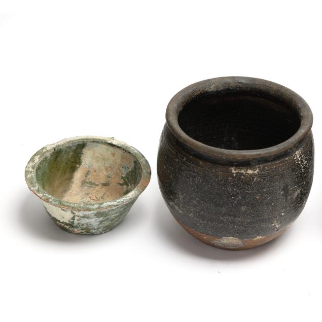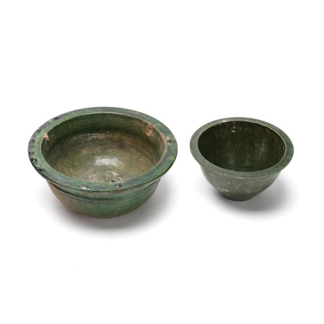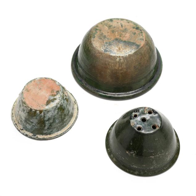 From the Estate of the late Susan C. Frankenberg, Hillsborough, North Carolina Glaze and firing anomalies as made; tapered ovoid vase with crazing and hairlines, possible old break and repair to base, break and restoration to rim; a few scuffs to body of brown glazed pot; loss to handle of largest green bowl, chip to rim; loss to one foot of bowl with drainage holes; scattered chips to rim of smallest bowl.