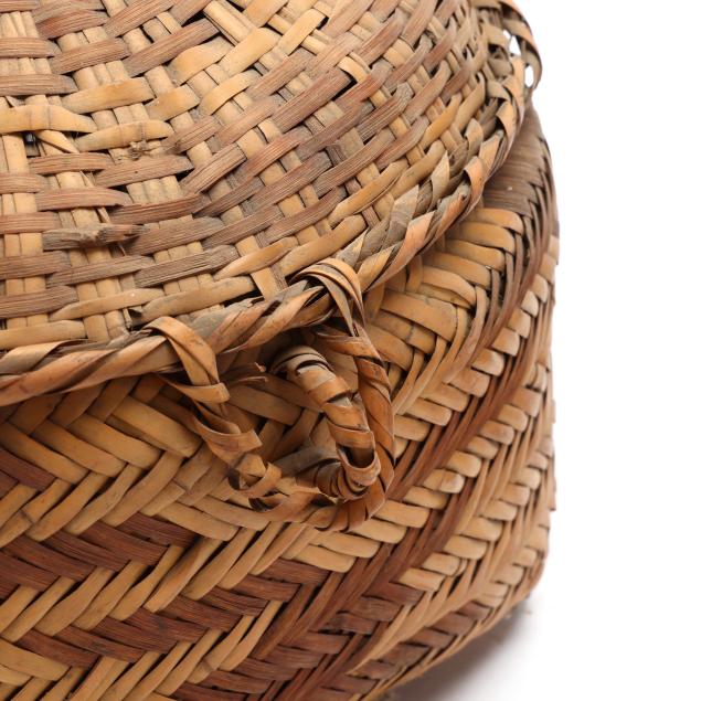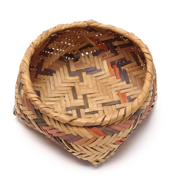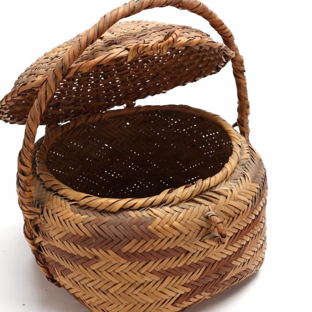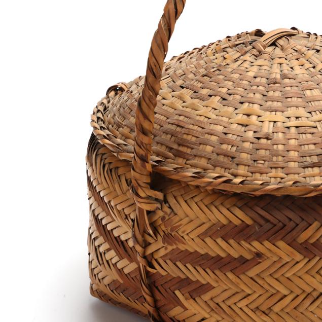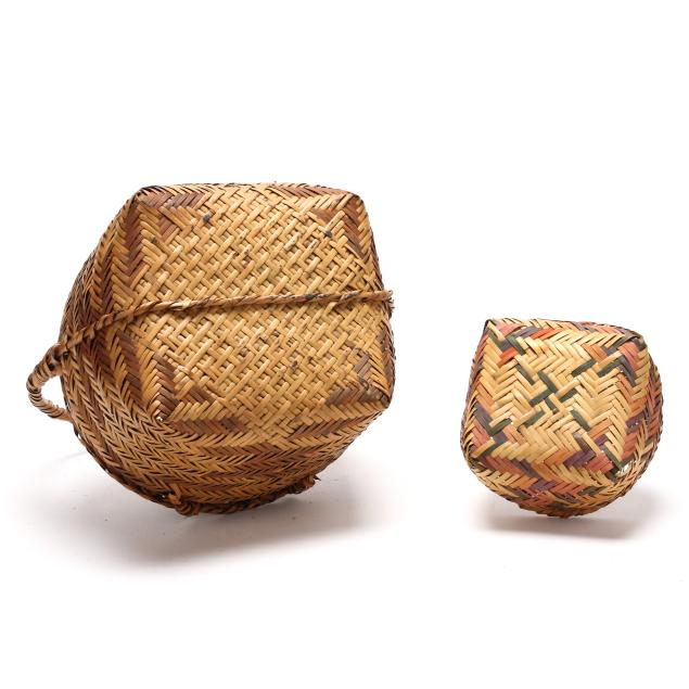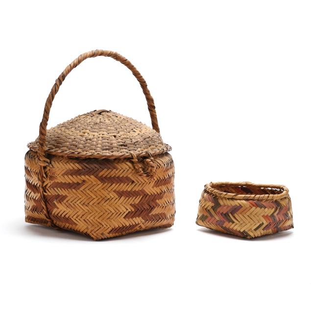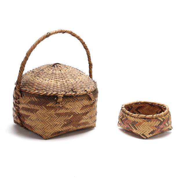 First half 20th century, splint oak and river cane with natural dyes, the larger a hinged lidded storage basket attributed to Cherokee peoples, with continuous bail handle wrapping underneath the base (15 x 13 x 12 in.); the smaller a squat squared form with round rim, interior retaining identification tag for artist Annie [?] of Coushatta peoples (3 3/4 x 7 x 7 in. diameter).