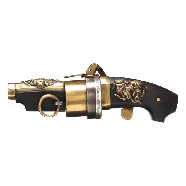 Five shot brass, steel, and wood single action revolver, male lion character present on top of barrel, octopus seizing another figure present on left side of wood grip, wreath with foliage and fruit present on right side of wood grip, brass lanyard loop.