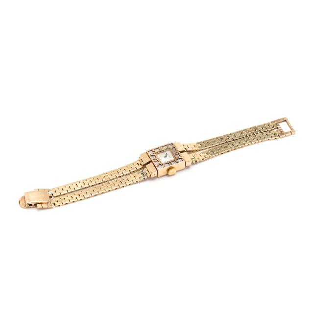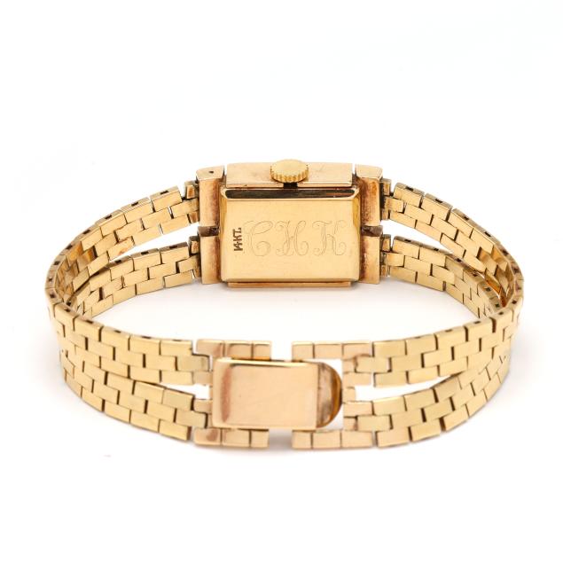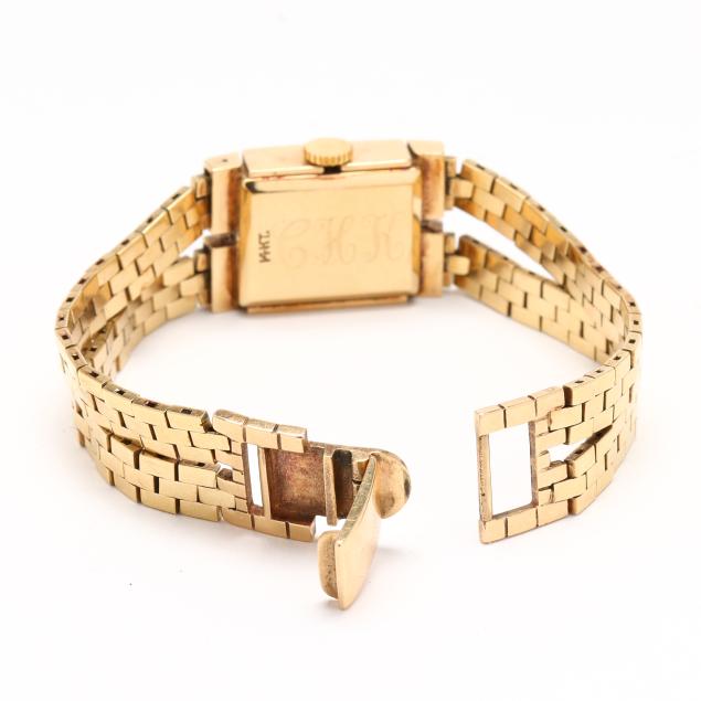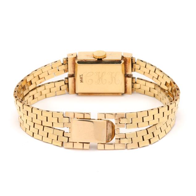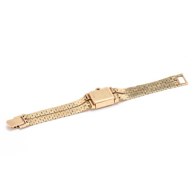 Manual wind, LeCoultre 490/BW, serial number 566496, the square gold case with Arabic numeral hour markers to bezel, the signed white dial with blued steel sword hands, the gold double bracelet with brick style links, completed with gold fold over clasp, the caseback stamped 14KT and monogrammed, all testing 14KT.