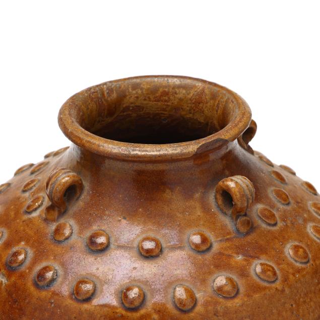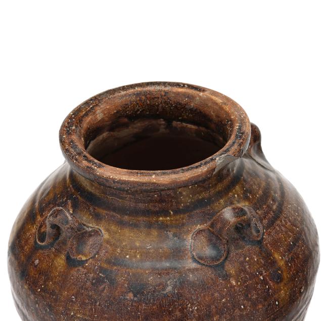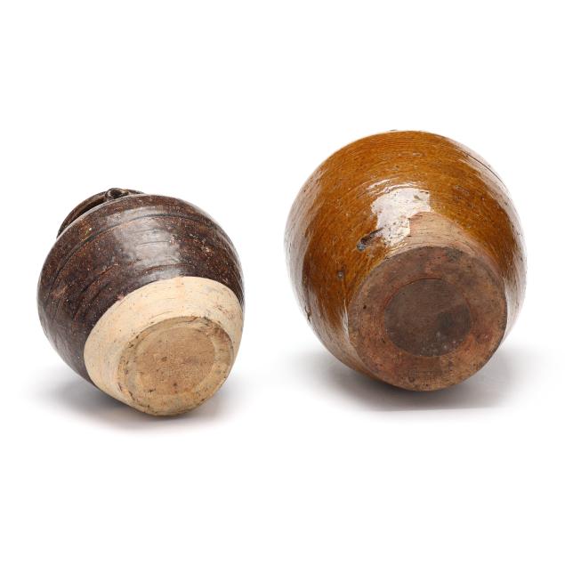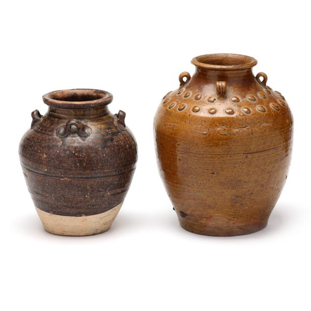 20th century, the larger jar with chestnut brown glaze with multiple strap lug handles to around the rim, molded bullets to the upper body by the shoulders, and the smaller jar with dark brown glaze, four lug handles to shoulder on upper body, unglazed to lower body and underside.