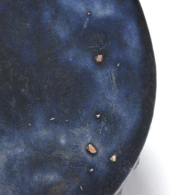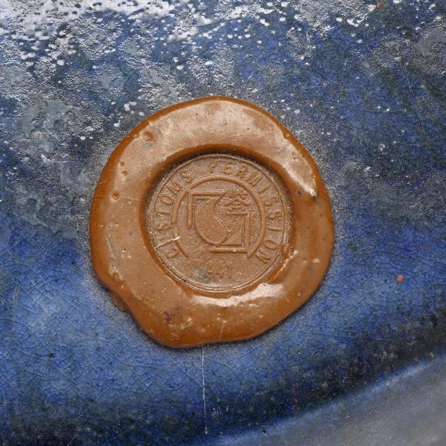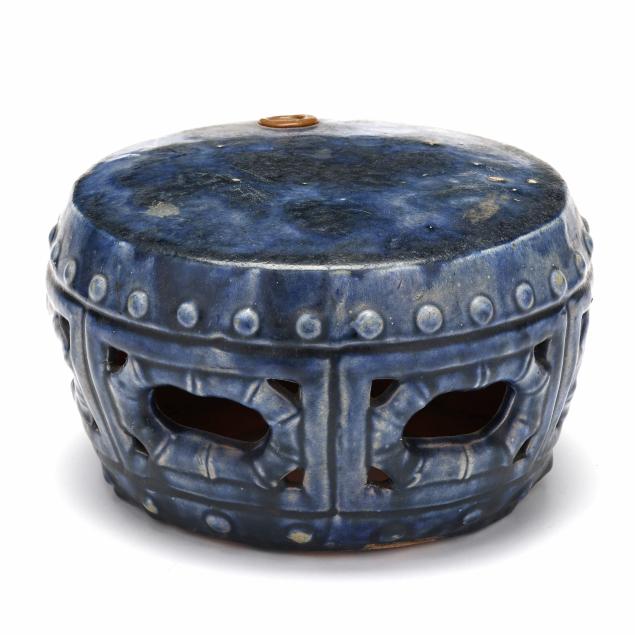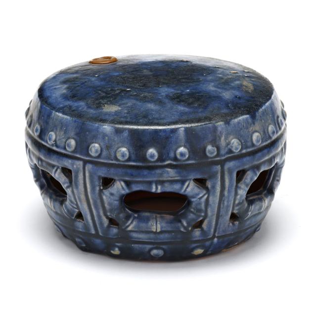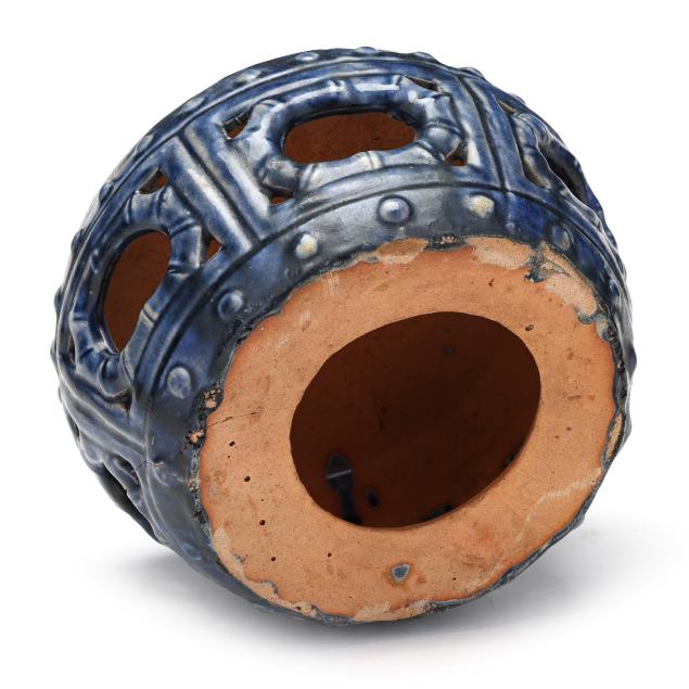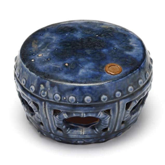 Early 20th century, blue glazed earthenware stand with reticulated geometric forms to sides, stamped with brown wax export seal to top, otherwise unmarked.