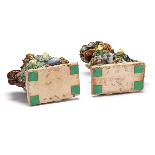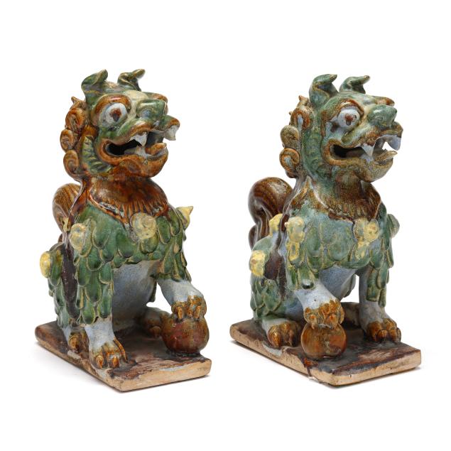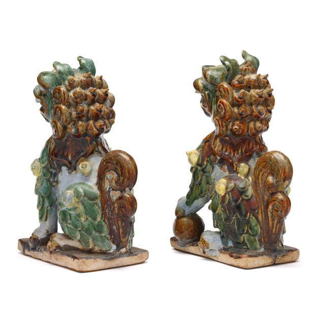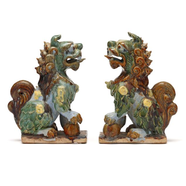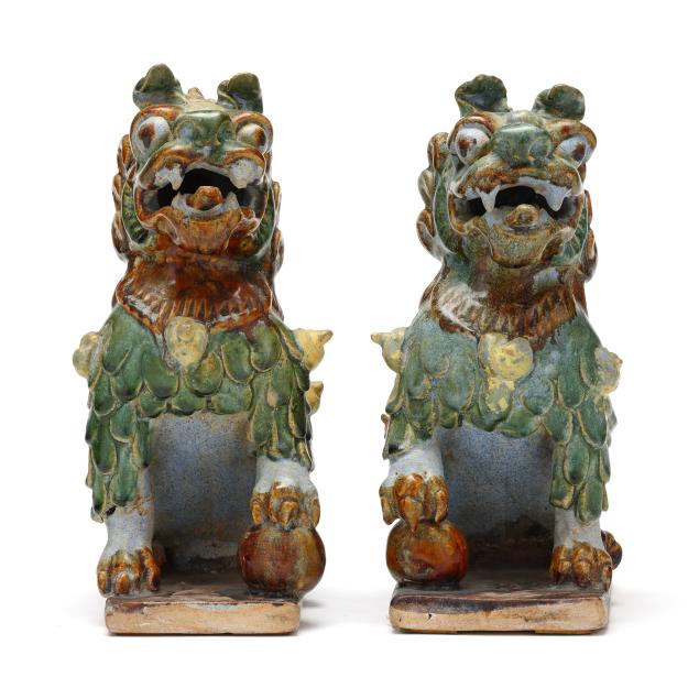 Late 19th to early 20th century, a pair of Shiwan style stoneware seated foo dogs holding balls, with lemon yellow, light blue, green and brown glazes.