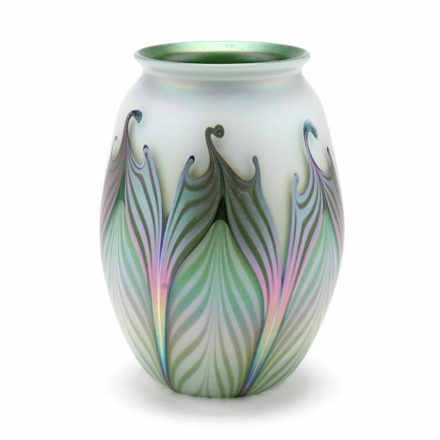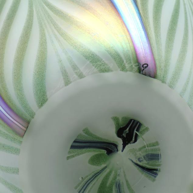 1989, blown white over green iridescent glass with pulled silver and green feather motif, polished pontil, signed.