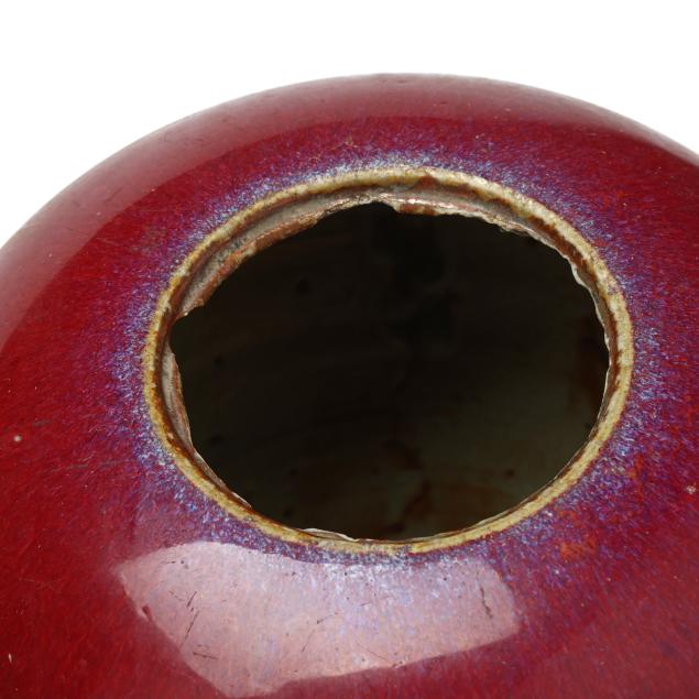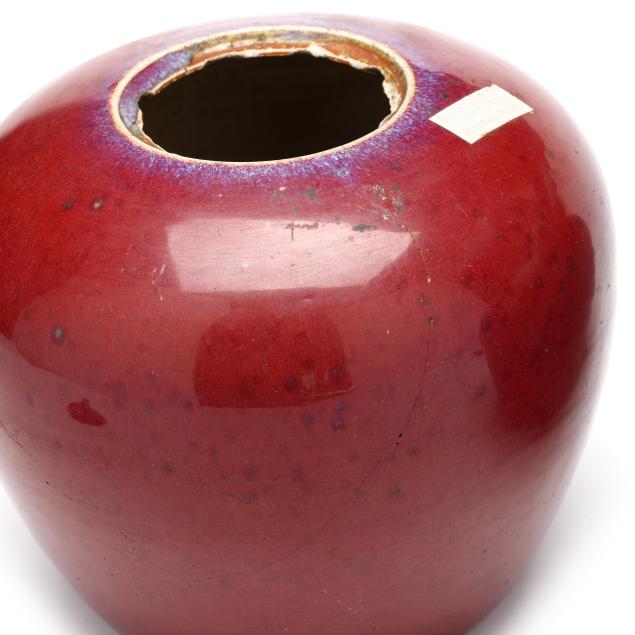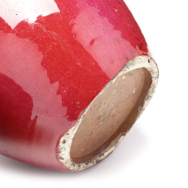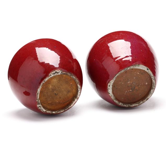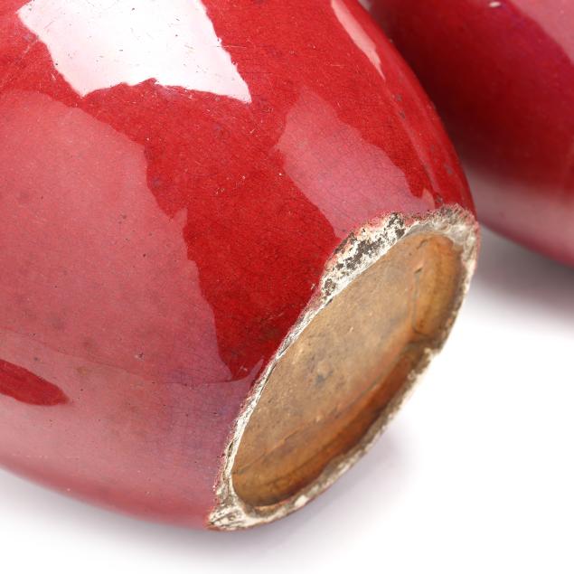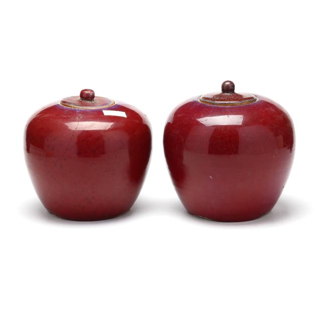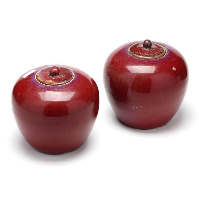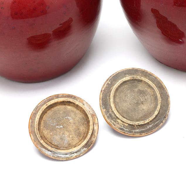 20th century, each with deep scarlet red glaze, fitted lid with rounded finial, rough edge to interior rim and foot rim, unglazed underside.