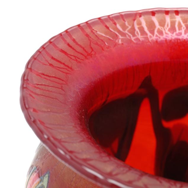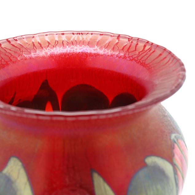 1991, blown ruby red iridescent field with pink flower blossoms and green leaves, polished pontil, signed.