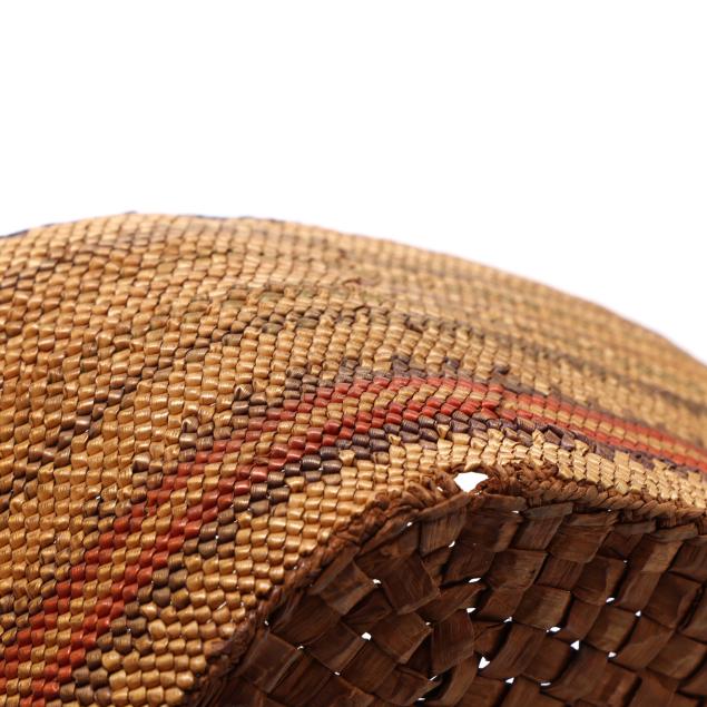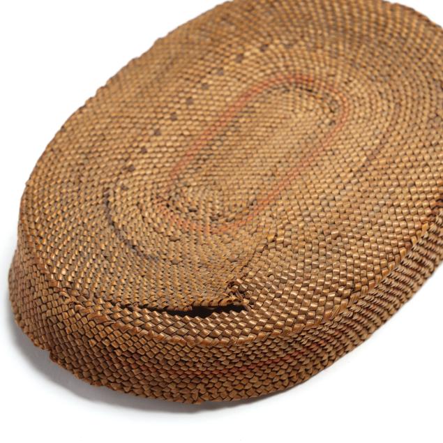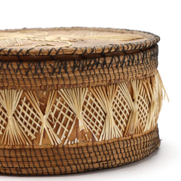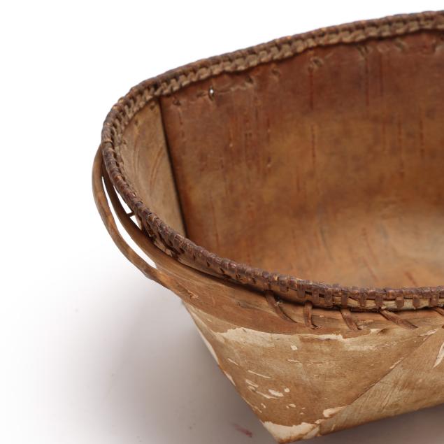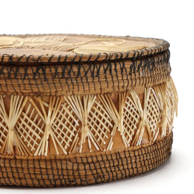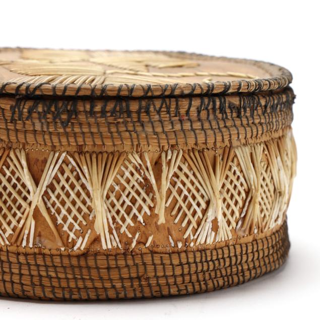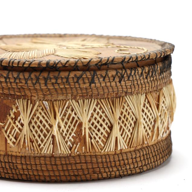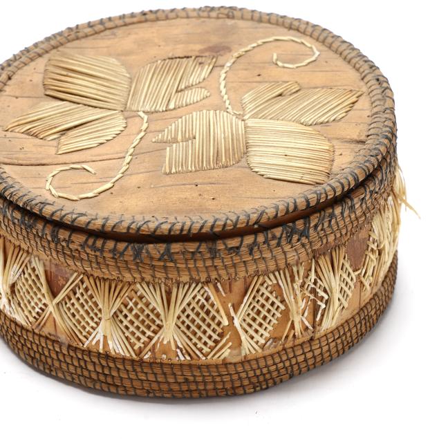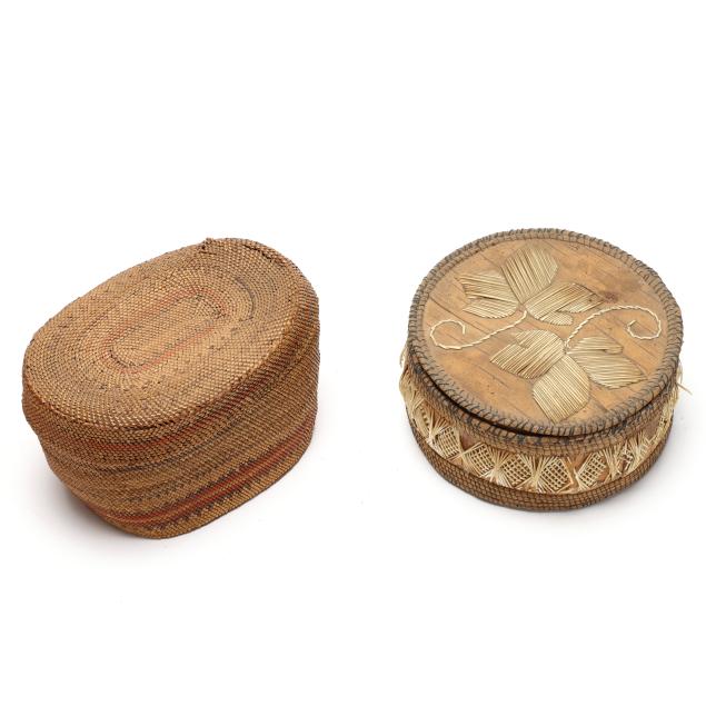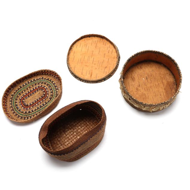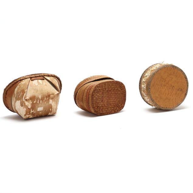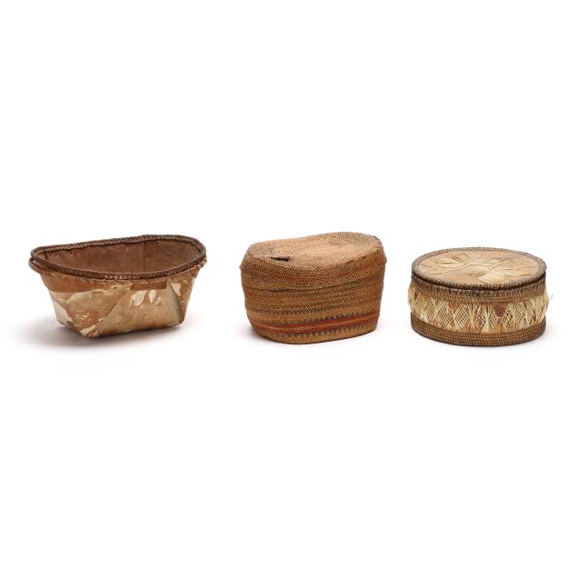 Early 20th century, to include: an intact Chippawa openwork basket (3.5 in. high); a Canadian Ojibwe sewing basket with applied quillwork (2.75 x 5.75 in.); and a Nooktah lidded basket from the Pacific Northwest with a split to the lid (3.25 x 6.5).