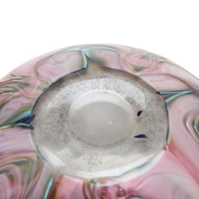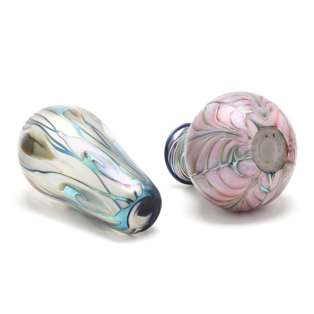 The taller a white iridescent "Leaf & Vine" teardrop shaped vase (8.25 in.); and the shorter a David Lotton pink pulled foliate vase with green-blue iridescent swirl neck, signed (6 in.).
