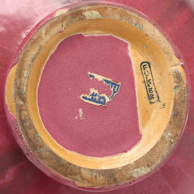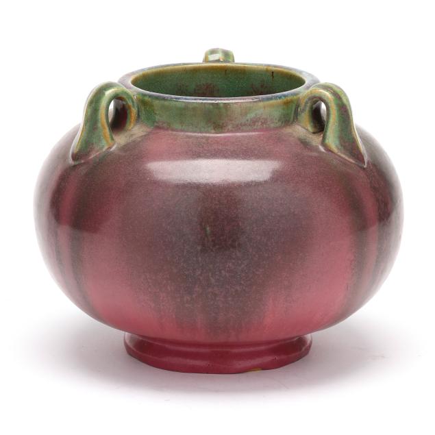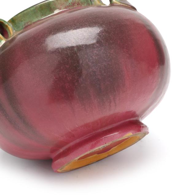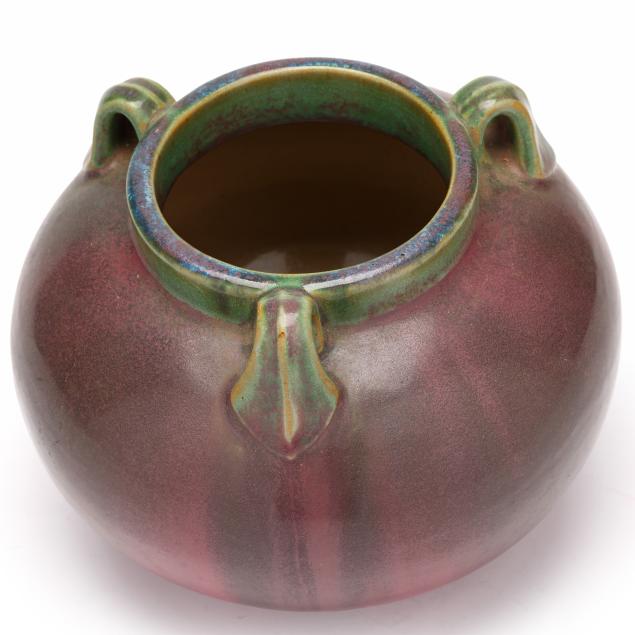 Flemington, New Jersey, circa 1917-1934 oval ink mark, retaining partial paper label to underside, of bulbous squat form with three scrolled handles and round foot, featuring a rose flambe glaze with a celadon glazed collar.
