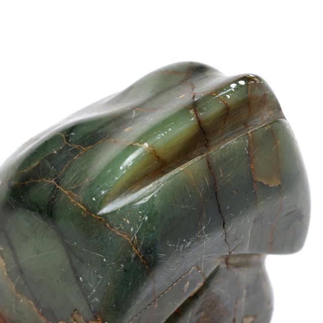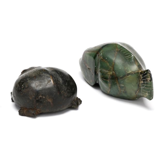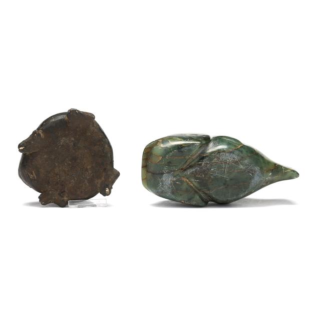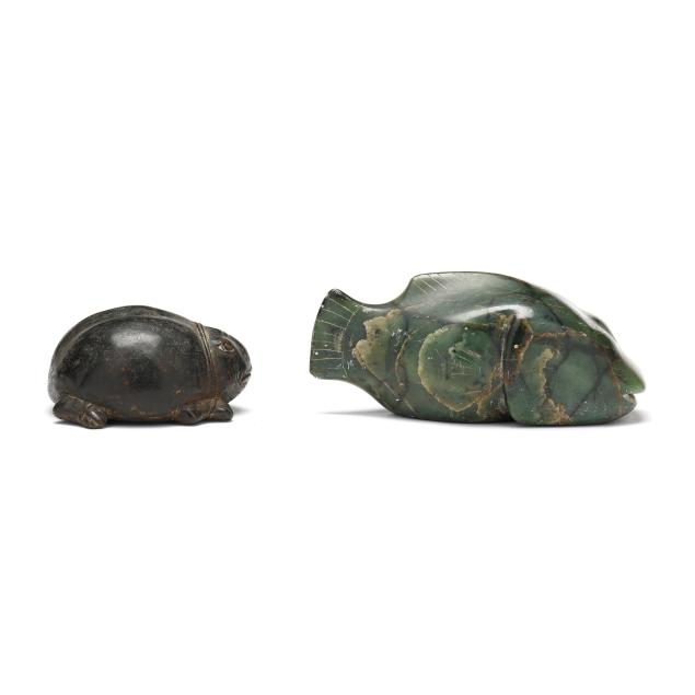 The first of a frog cast in bronze with an applied patina, possibly African, age uncertain (2 x 4 x 4 in.); the second possibly Inuit, carved green stone of a stylized fish with etched eyes and fins, likely mid-20th century (3 x 6 1/4 x 2 3/4 in.); both unsigned.