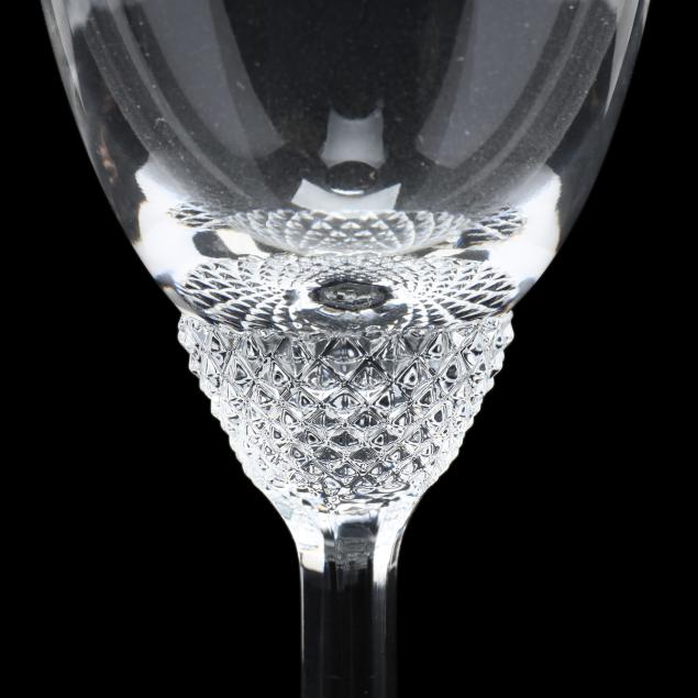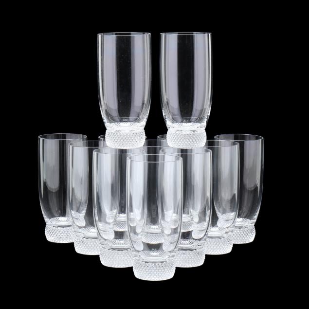 Late 20th century, clear crystal with diamond pattern foot, including (12) flat tumblers (6 in.) and (4) fluted champagnes (9 in.), signed.