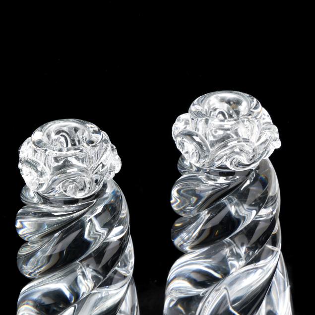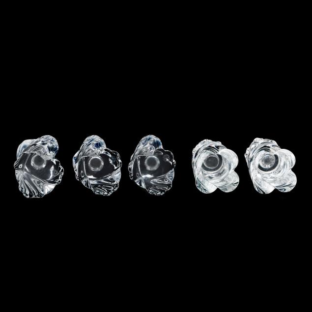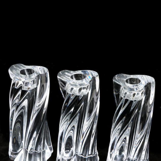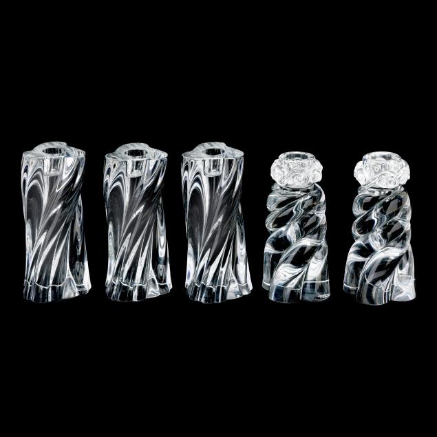 France, late 20th century, including (3) Odilon candlesticks (6 in.), and (2) Aladin candlesticks (6 in.), signed.
