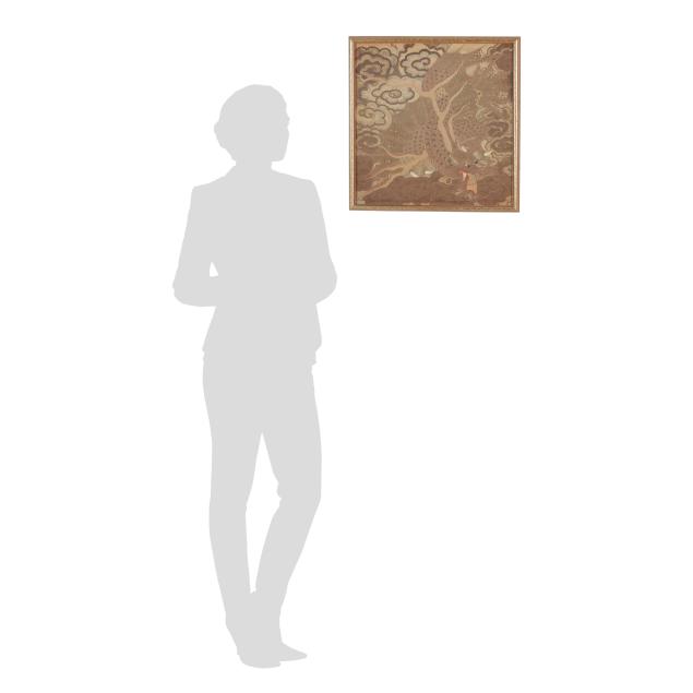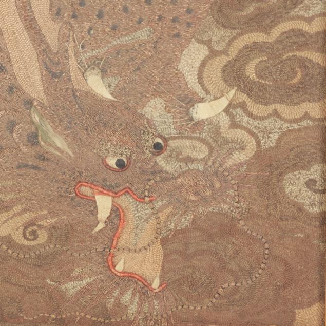 Meiji period (1868-1912), an incredibly complex and impressive embroidery of a dragon flying through swirling clouds, silk and metallic wrapped thread, employing a variety of stitching techniques that give the embroidery a three-dimensional appearance, appears unsigned but clearly the work of a textile master from the Meiji period in Japan.
