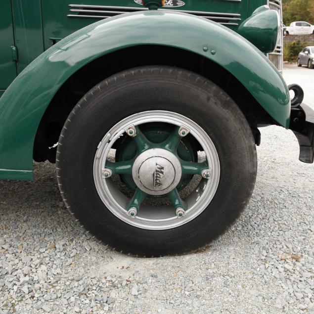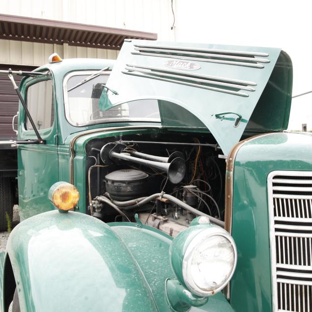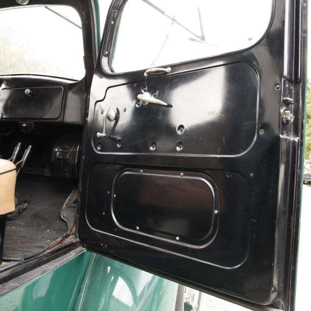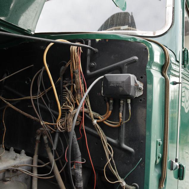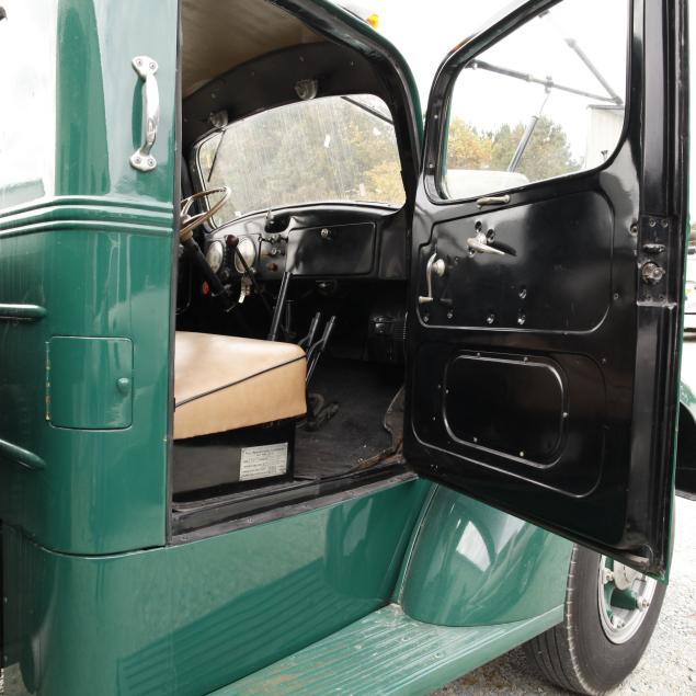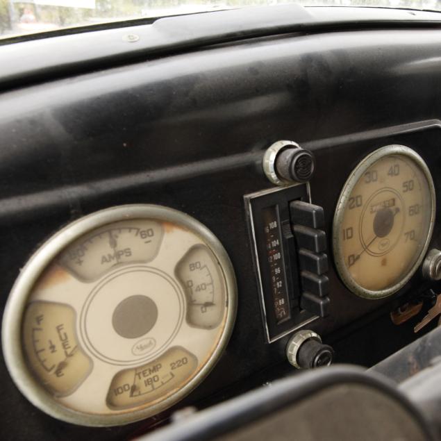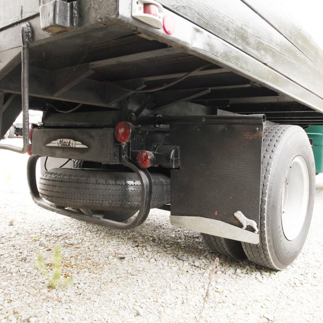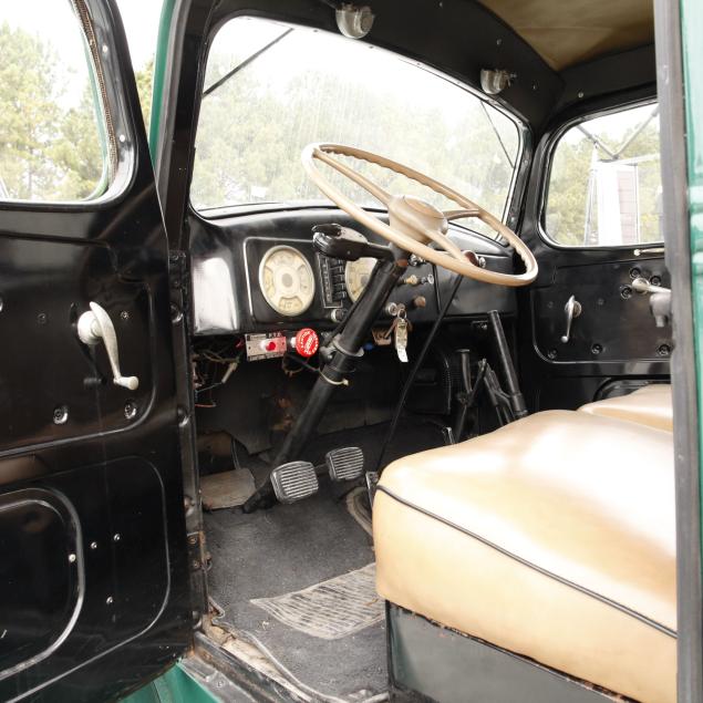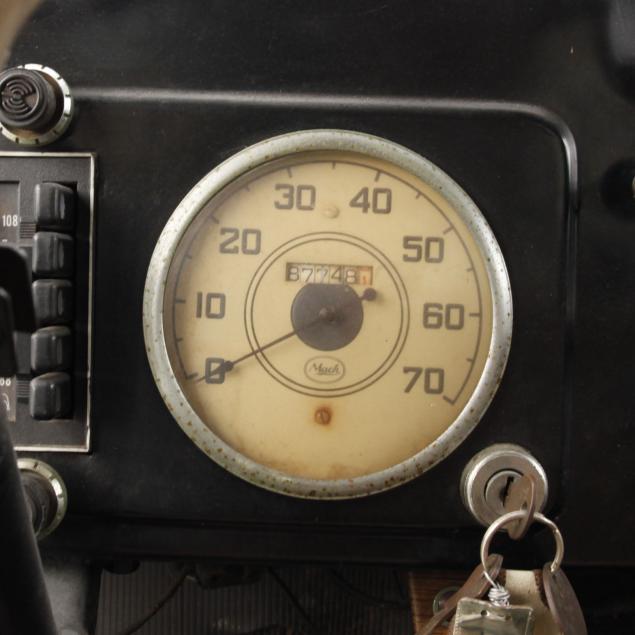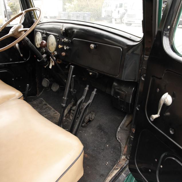 Exterior in green paint, and beige vinyl interior. The original Mack gauges appear to operate correctly, and an original AM/FM radio is installed in the center of the gauges.