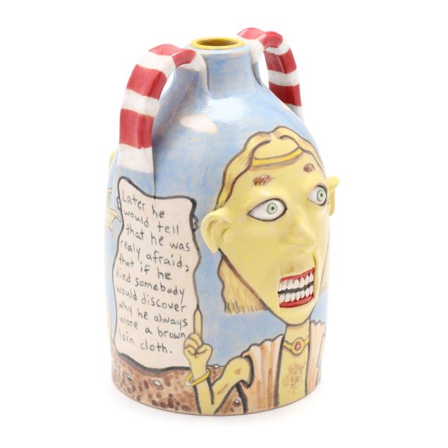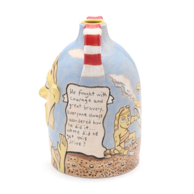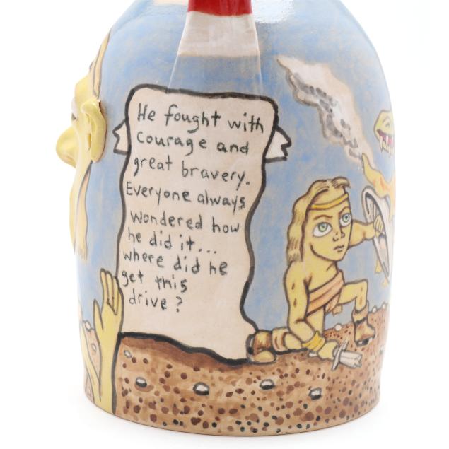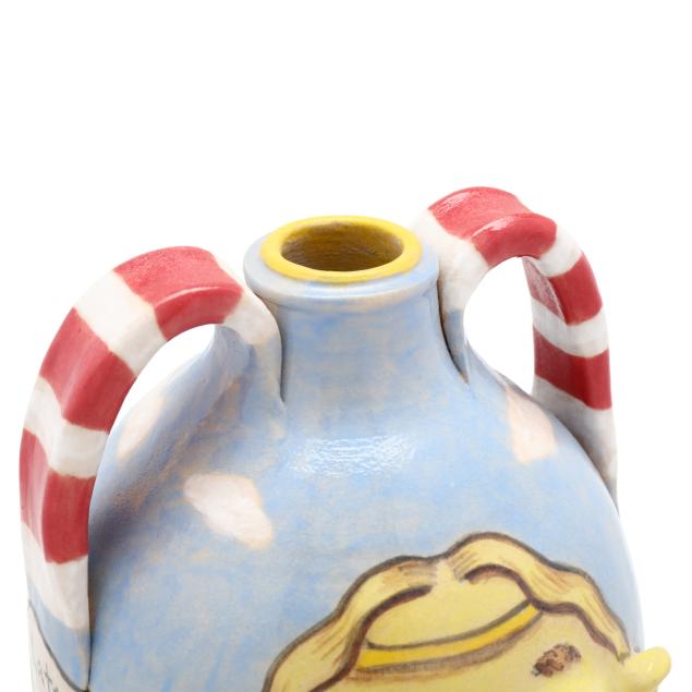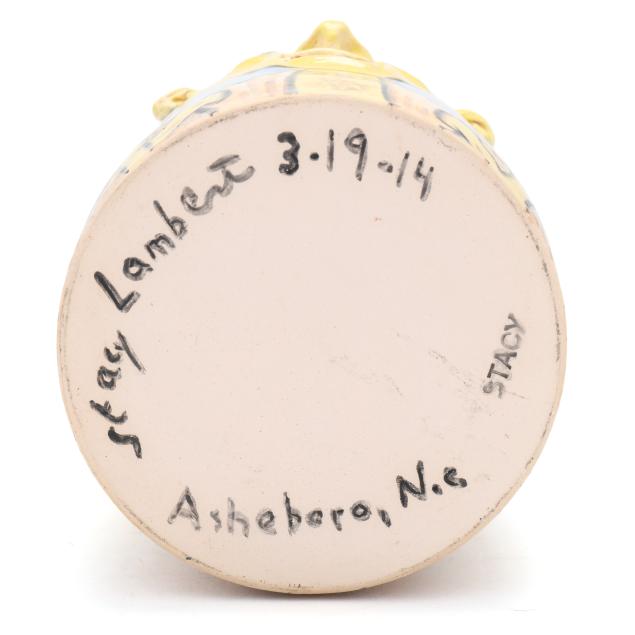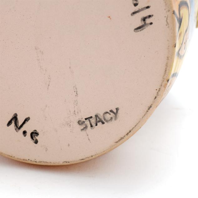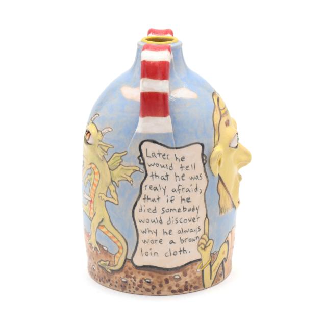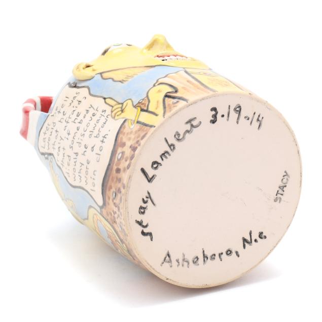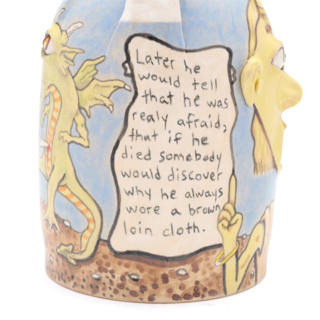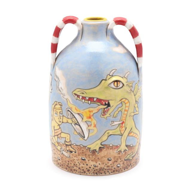 2014, hand-built and wheel turned ceramic jug with polychrome decoration, featuring a face and a fire-breathing dragon, with an applied handle and text on each side; signed and dated on the underside and additionally stamped "STACY."